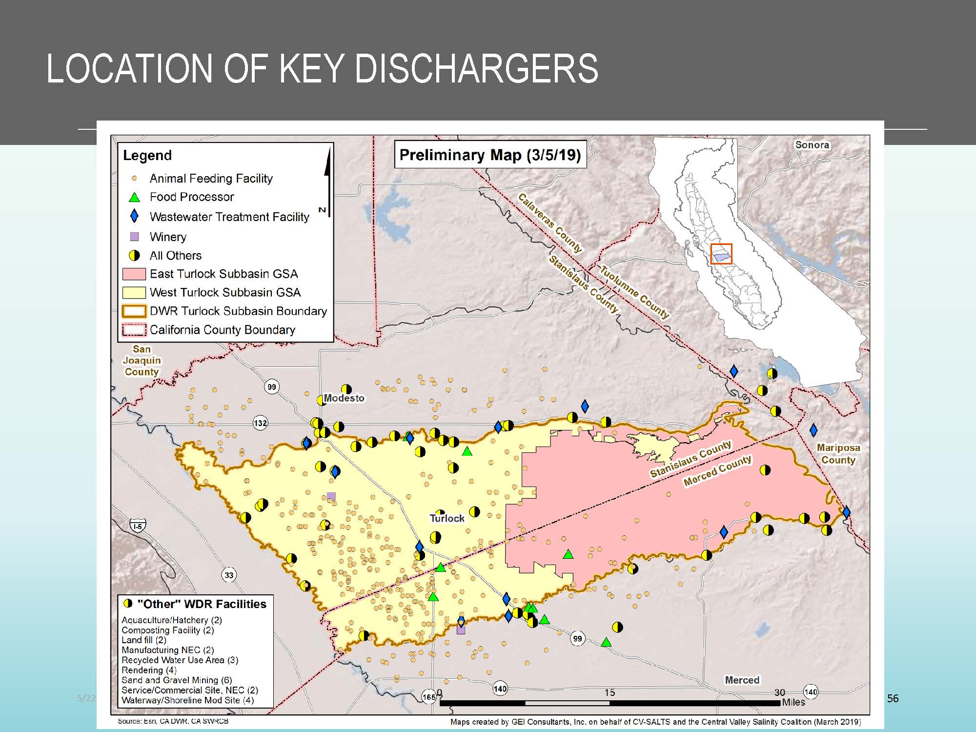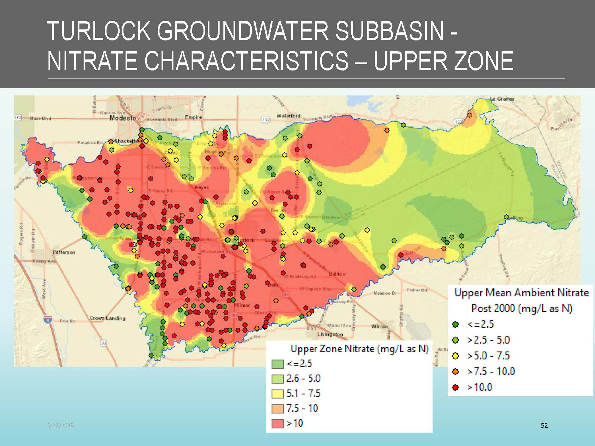 Ms. Dunham then presented a map of the Turlock groundwater basin, noting that the CV-SALTS has a comprehensive database for nitrates and salts in California and the map of the Turlock basin shows the level of detail that they have.