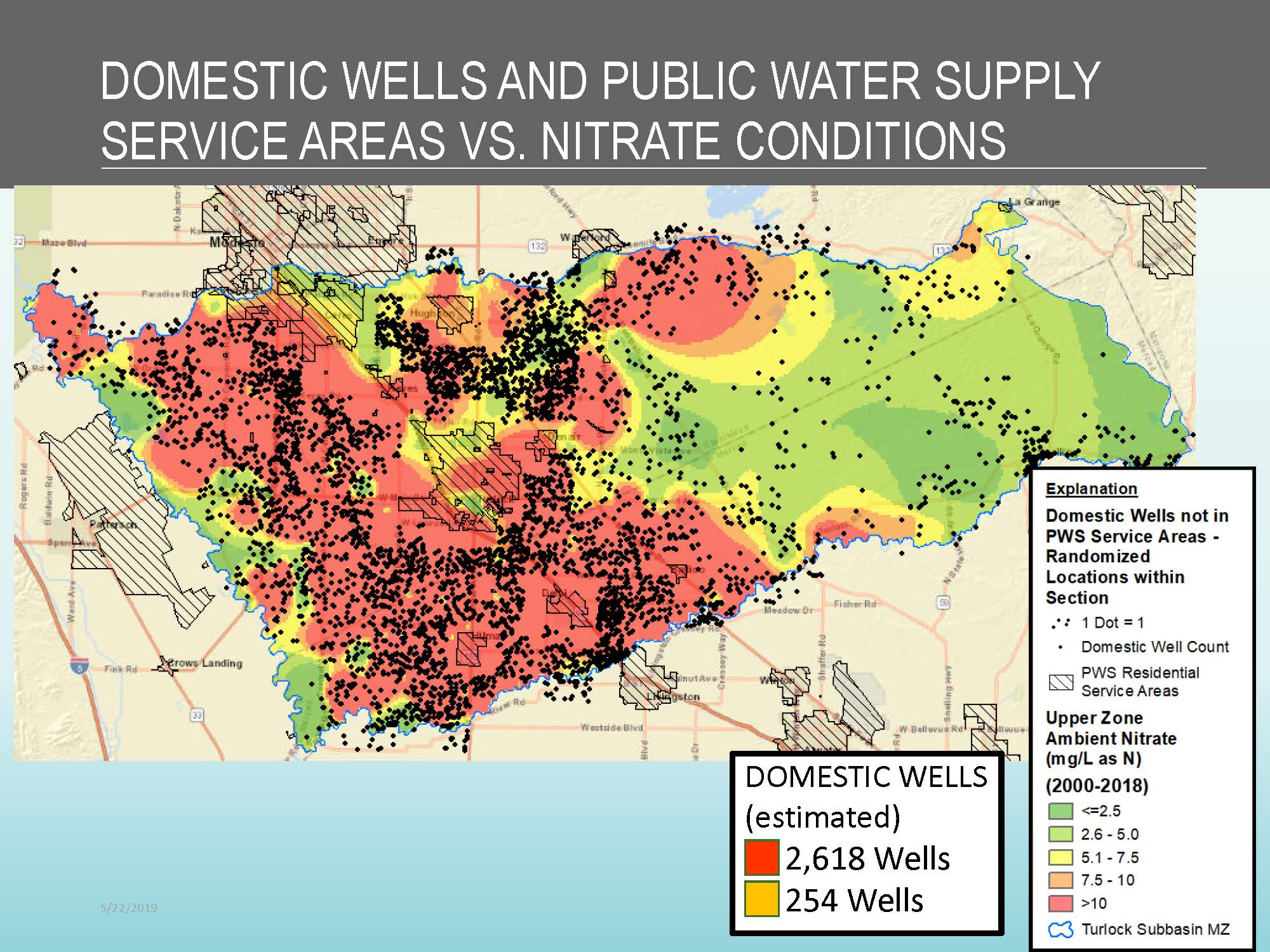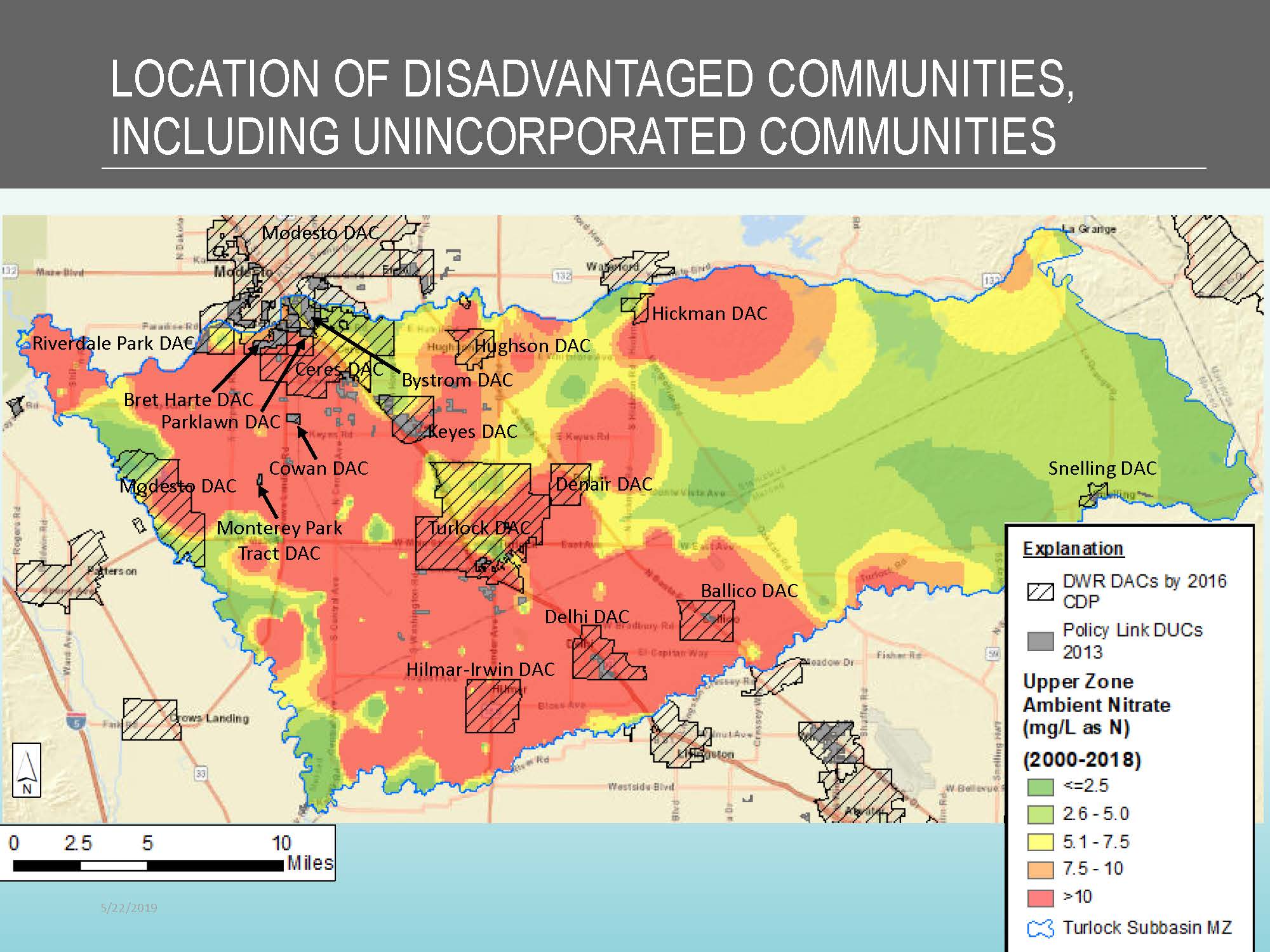 He then presented a series of maps that were developed for the Turlock subbasin as part of the project that show where there are nitrates in the upper aquifer, disadvantaged communities, domestic wells, and locations of key dischargers.