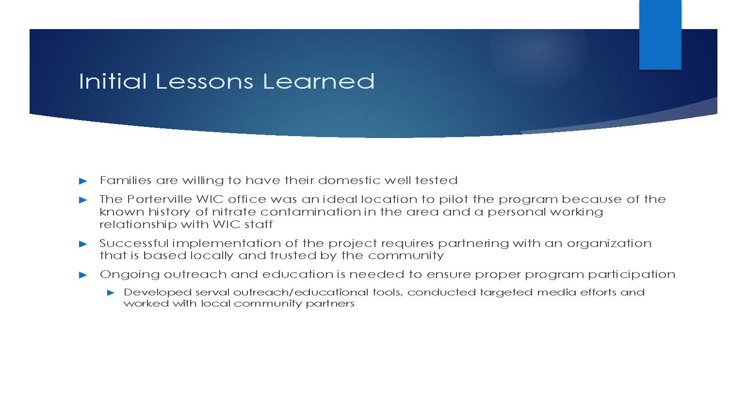 As for lessons learned, they learned that families are willing to get their water sampled; they even had folks outside of the Porterville area interested. One of the goals was to target vulnerable populations so partnering with the Porterville WIC office was a great idea because that’s who they directly work with, she said.