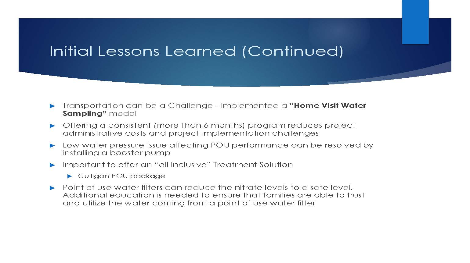 Customers had two options for replacement water. The first was bottled water home delivery service from a local vendor; the family would receive a certain amount of five gallon jugs and as they were used them, it was replenished. The second option was to install a point-of-use (POU) filter that would be installed in the kitchen sink to filter the water coming out of that tap. They created a screening tool to determine who would qualify for a point of use device. If the person is a renter, you must obtain the permission of the homeowner. Also, it’s important to make sure the unit can actually reduce the levels to safe levels, because in some instances, the nitrate levels were pretty high.