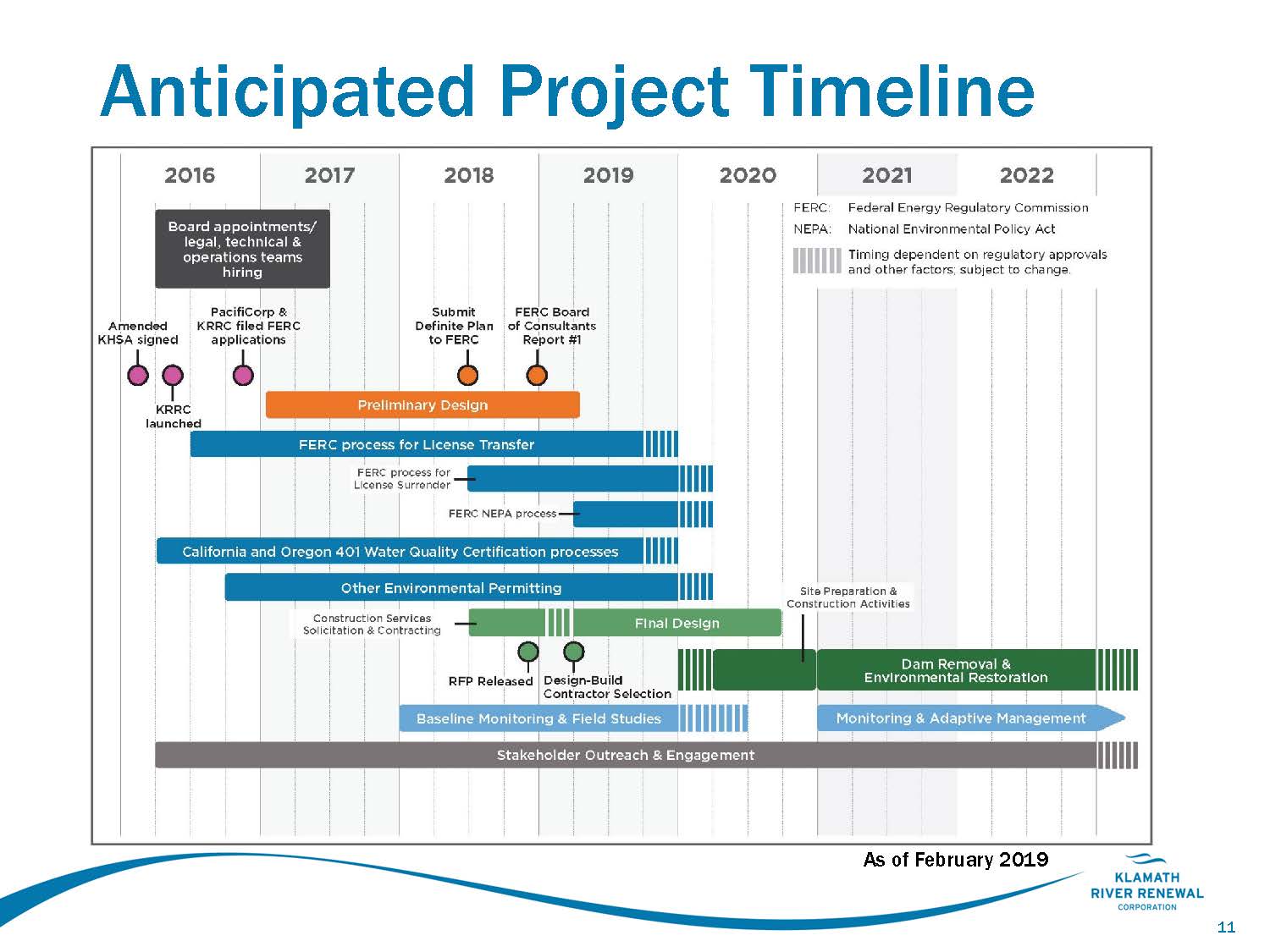 Under the current scenario, there is the FERC process for license transfer and license surrender; they are still waiting for a decision from FERC and they have no idea how long it will take them to make the decision. So they have the contractor ready to get out in the field for early work with the goal of being able to initiate drawdown of the reservoirs in January of 2021, followed by dam removal in 2021- 2022.