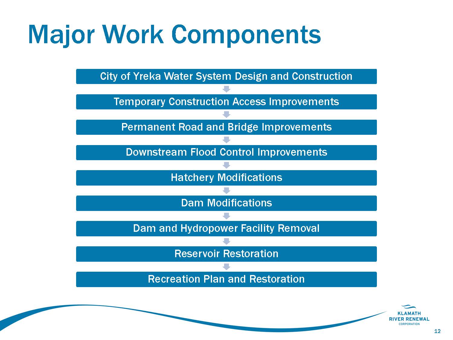 There are a number of major components to the project. There is a water line for the city of Yreka at the bottom of Iron Gate Reservoir which will need to be relocated prior to drawing down the reservoirs. They will need temporary construction access and to make permanent transportation improvements. They will have to address downstream flood control; there are about 2 dozen properties identified in the 18 mile reach below Iron Gate that are subject to increased flood risk, so they will be elevating and building levees, buying out flood easements, and other solutions for those properties.