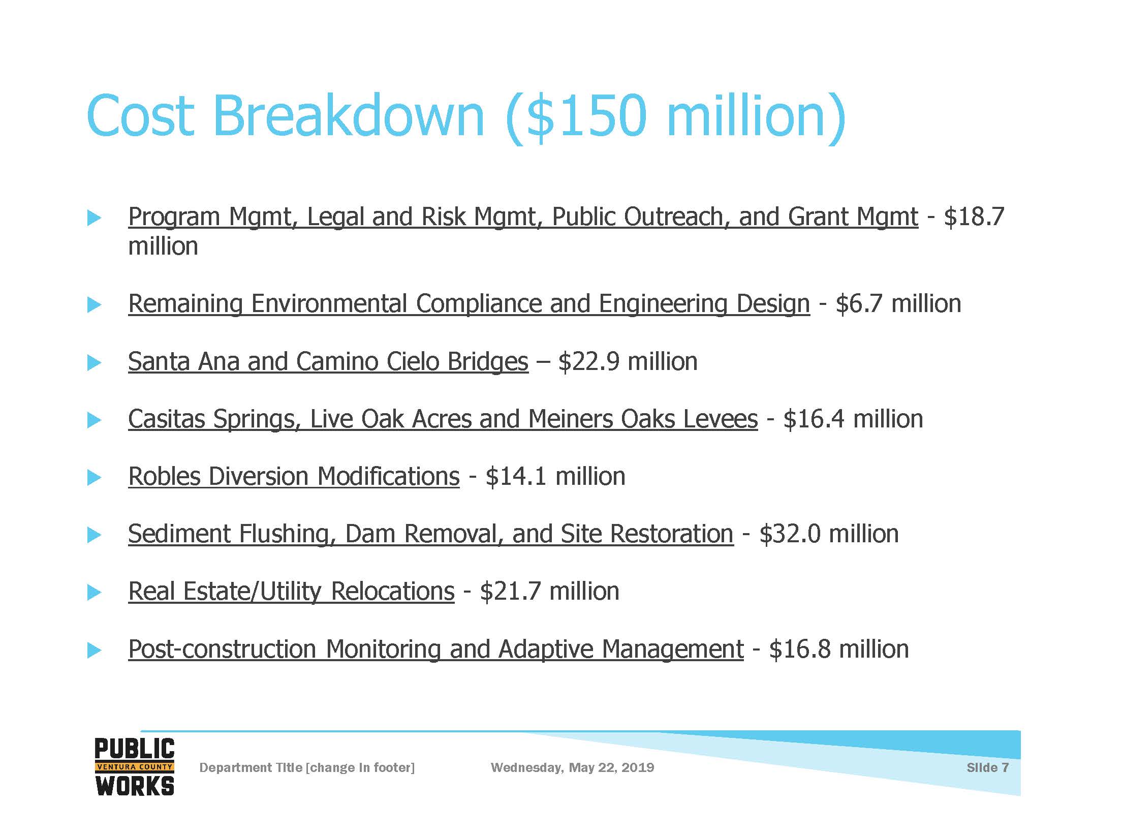 The project is currently estimated to cost $150 million, which includes program management, legal and risk management, outreach and grant management, environmental compliance and engineering design. They currently have a CEQA and NEPA document and a biological opinion, which will have to be revisited with the new dam removal alternative selected.