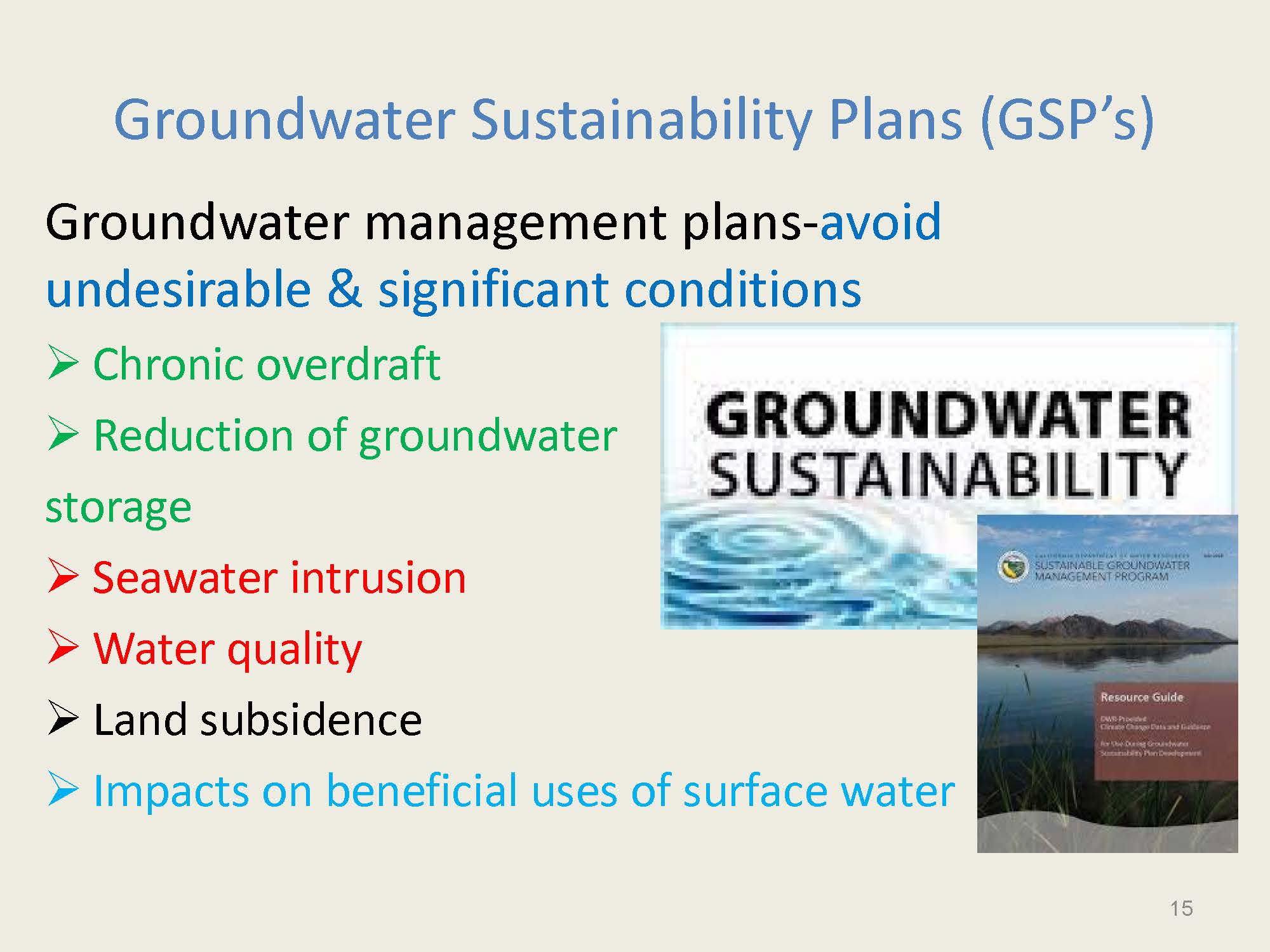 Might SGMA be a way to better connect our legal groundwater models? Mr. Sandino looked at the requirements for Groundwater Sustainability Plans, which are to avoid undesirable significant conditions of chronic overdraft, reduction of groundwater storage, seawater intrusion, water quality, land subsidence, and impacts to beneficial uses of surface water.