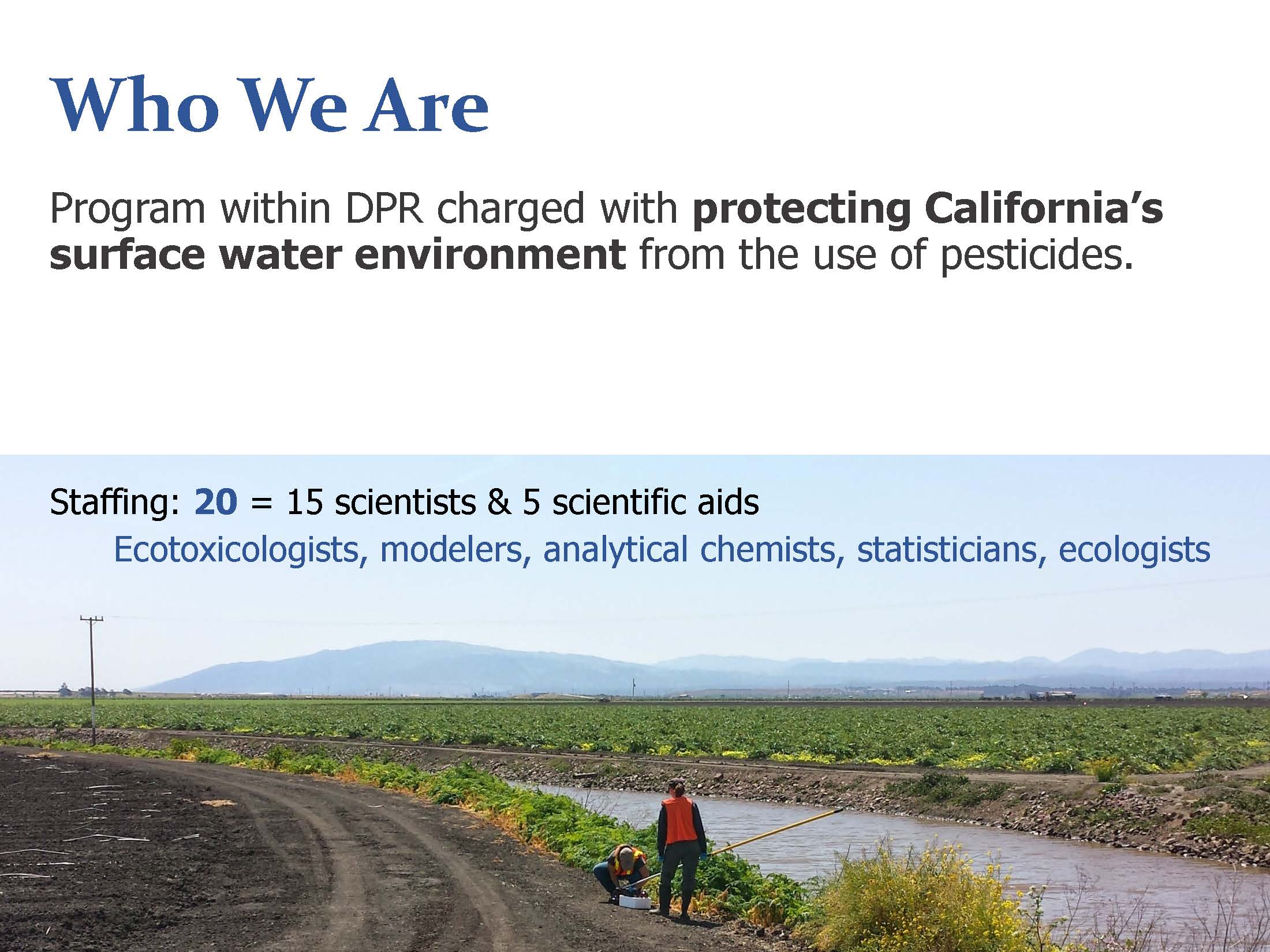 The Department of Pesticide Regulation has 15 full-time scientists and five scientific aides. The scientists have a wide range of expertise, including ecotoxicologists, modelers, local chemists, statisticians, and ecologists which helps them take a broad approach to the regulation of pesticides to protect surface water.