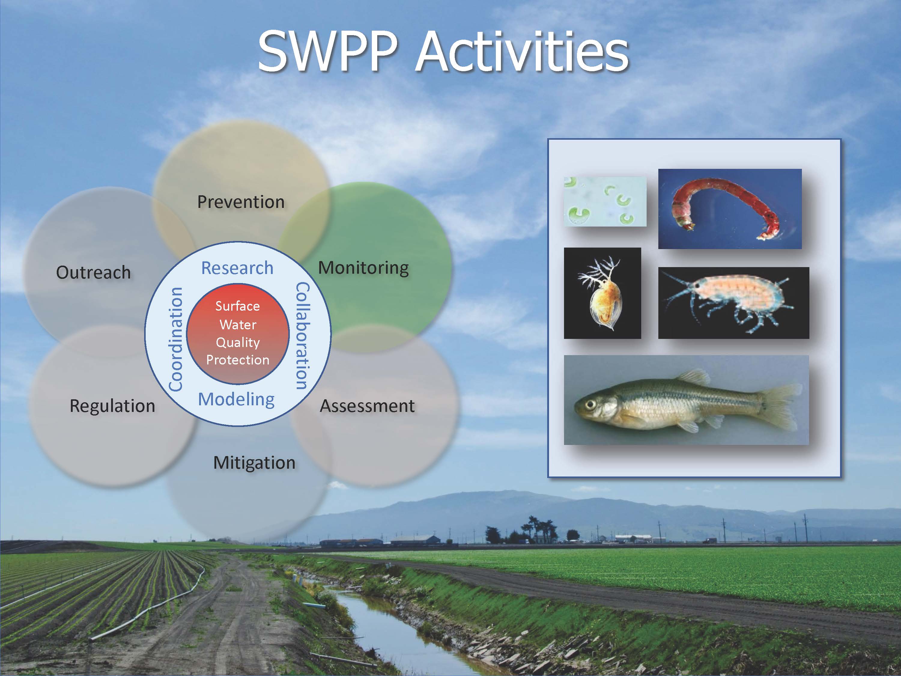 The mission of the California Department of Pesticide Regulation’s Surface Water Protection Program is to protect surface water from pesticide contamination caused by the use of pesticides in agricultural and urban environments. To achieve its mission, the program evaluates pesticide products, monitors surface water and sediment for pesticides, evaluates the effectiveness of best management practices to mitigate the offsite movement of pesticides, performs outreach to pesticide users to implement best management practices, and implements regulatory measures.