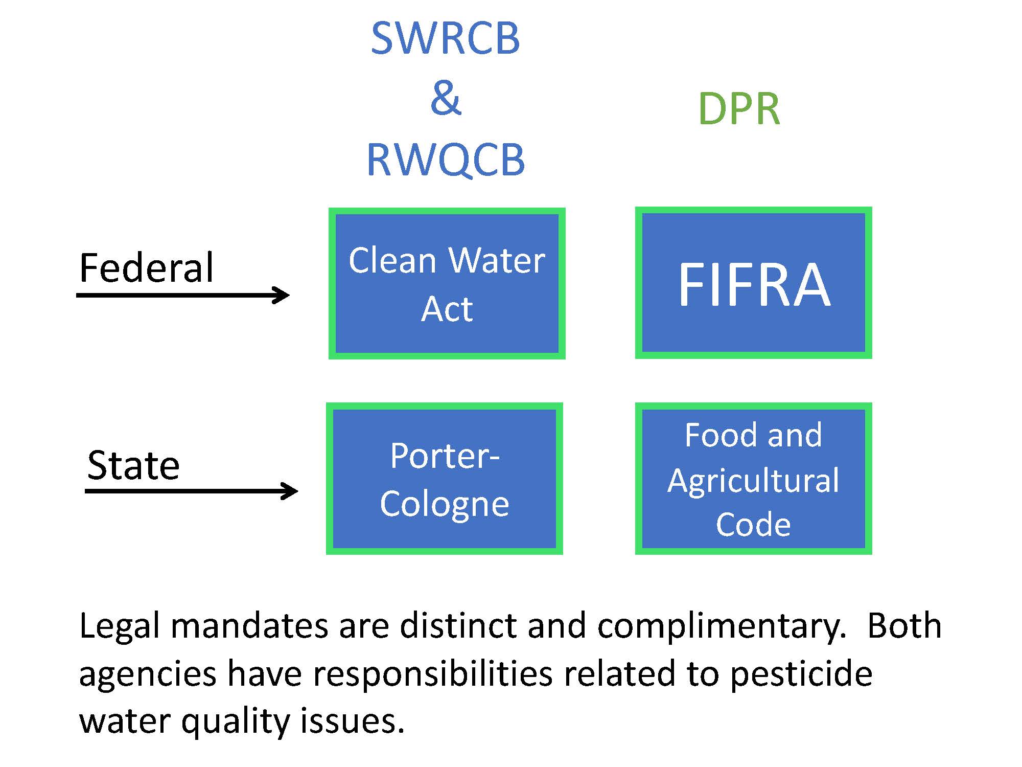 The State Water Resources Control Board and the regional boards operate under the Clean Water Act at the federal level and the Porter-Cologne Act at the state level. At the Department of Pesticide Regulation, they operate under the Federal Insecticide, Fungicide, and Rodenticide Act (FIFRA) at the federal level and the Food and Ag code at the state level.