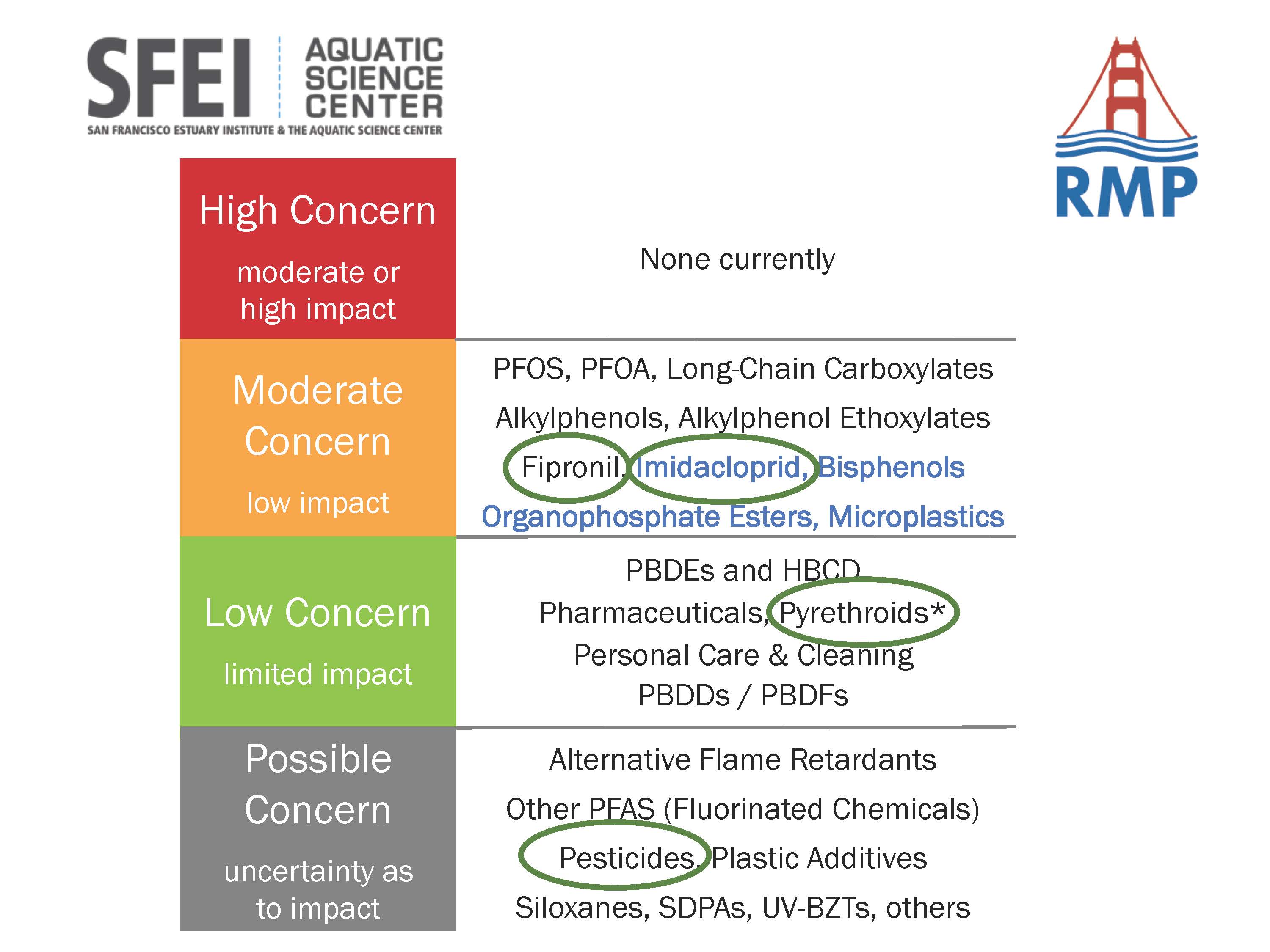 On the list of contaminants of concern in the San Francisco Bay, the pesticides fipronil and imidacloprid are of moderate concern. The pyrethroid pesticides are of low concern in the San Francisco Bay but are a higher concern in urban creeks.
