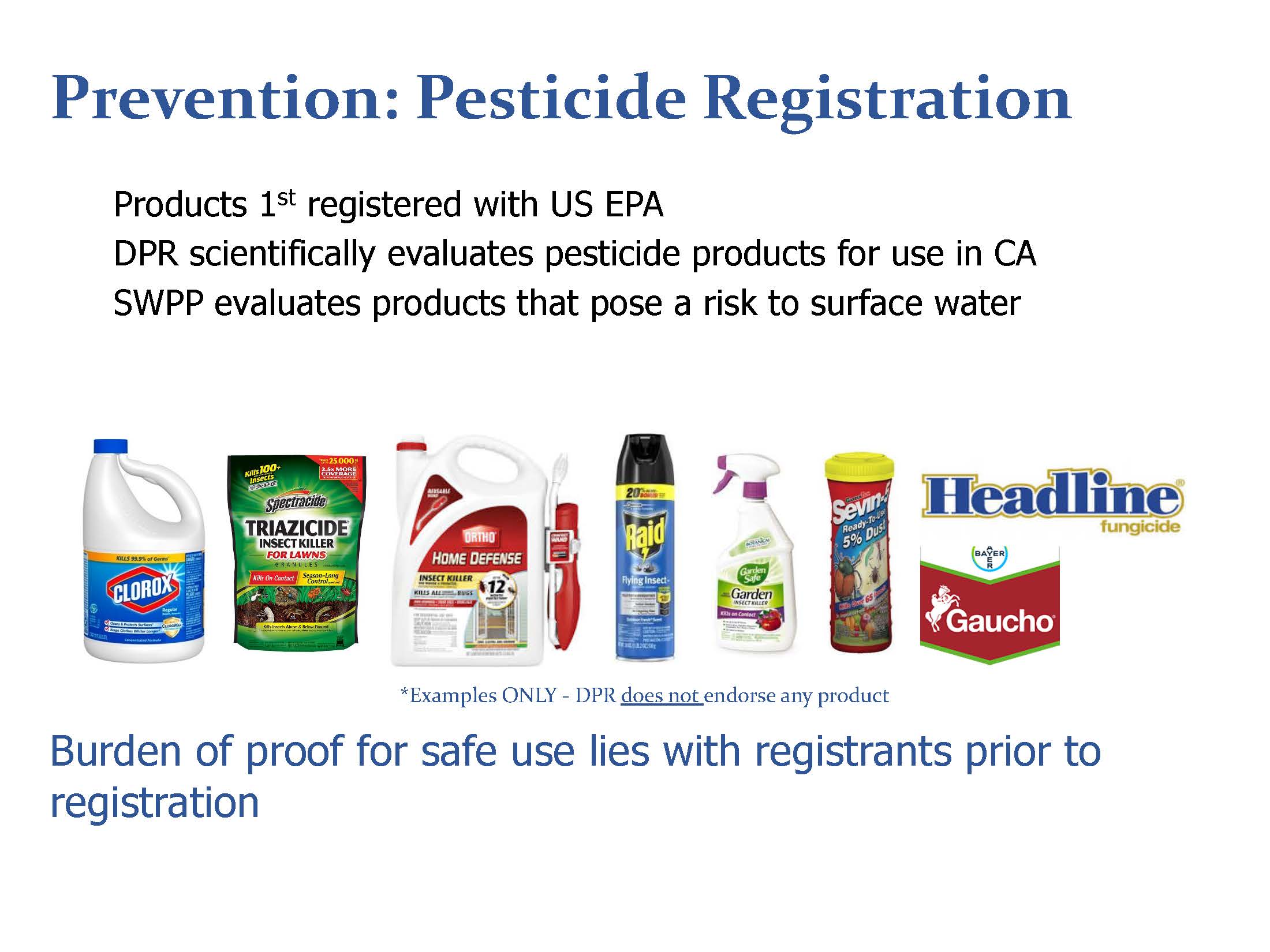 New pesticide products must first be registered with the federal government. In order to be sold within the state of California, it must next be evaluated by the Department of Pesticide Regulation. The Surface Water Protection Program evaluates the products that are of higher risk to surface water.