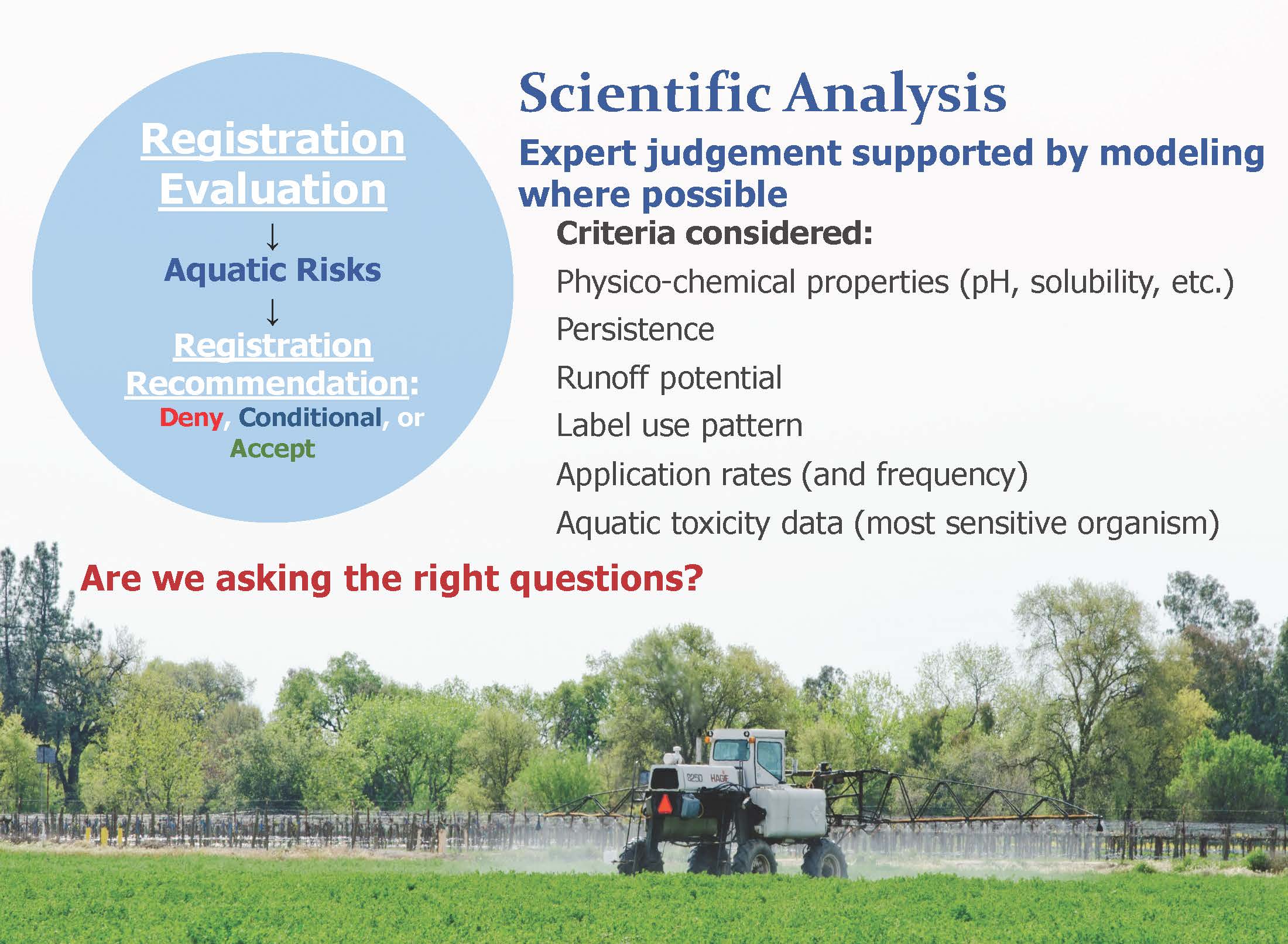 Since aquatic organisms are constantly in the water, the thresholds are frequently much, much lower for aquatic organisms versus humans, so aquatic organisms have been the Department’s main focus to date. They also keep a broad view and consider the exposure of humans to pesticides through drinking water.