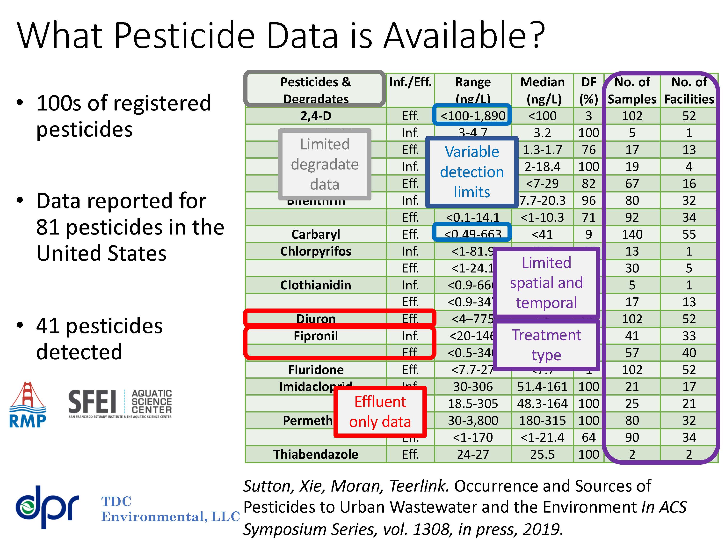 There are variable detection limits, everything from 100 nannograms per liter down to subnanograms per liter. The issue also happens with the same chemical, so if a study is saying non-detectable but the detection limit is too high, that doesn’t really give good information, she said. There is also limited data on degradates. To address these issues, the Department of Pesticide Regulation has launched a permanent wastewater monitoring project with wastewater treatment plants across the state.
