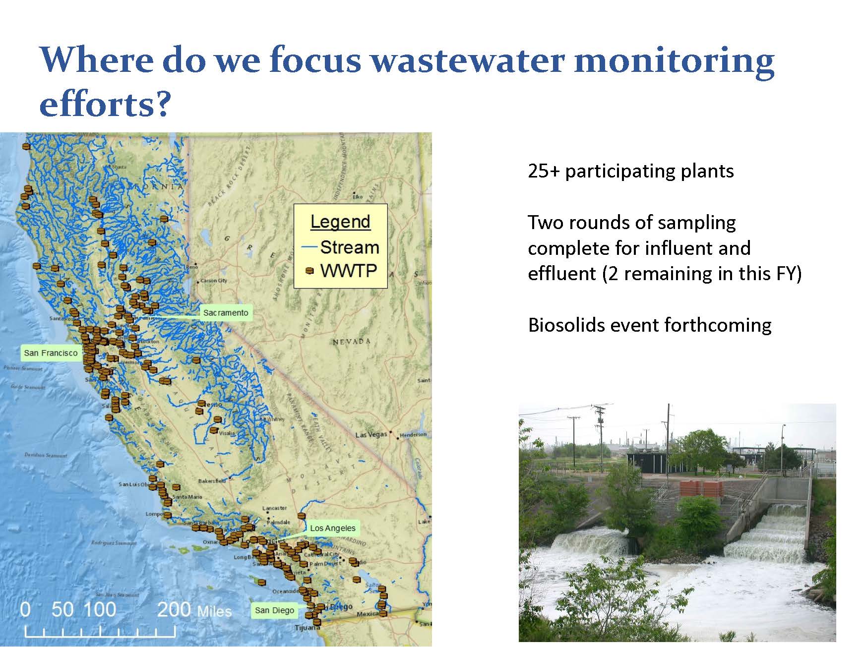 There are four components to their monitoring program: Agricultural streams impacted by pesticide use, urban streams, wastewater, and copper in marinas. In this presentation, Dr. Teerlink focused on urban streams and wastewater monitoring.