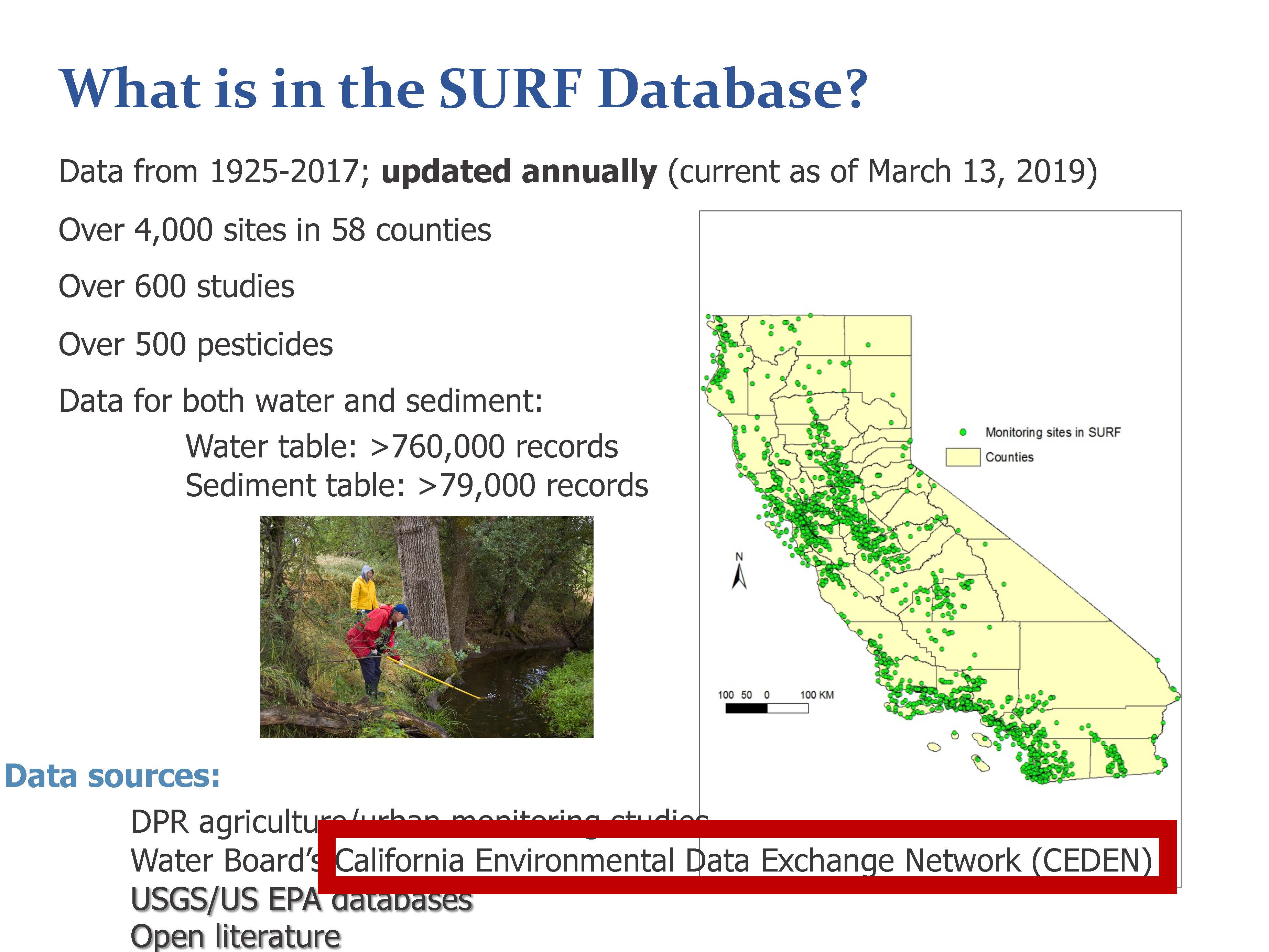 The Department of Pesticide has a database called SURF that has pesticide data for both water and sediment. The green dots on the map are the monitoring sites that are contained in the SURF database. The SURF database includes pesticide monitoring data from other state agencies, federal agencies, and regional groups. They’re approaching a million records for water and a hundred thousand records for sediment.