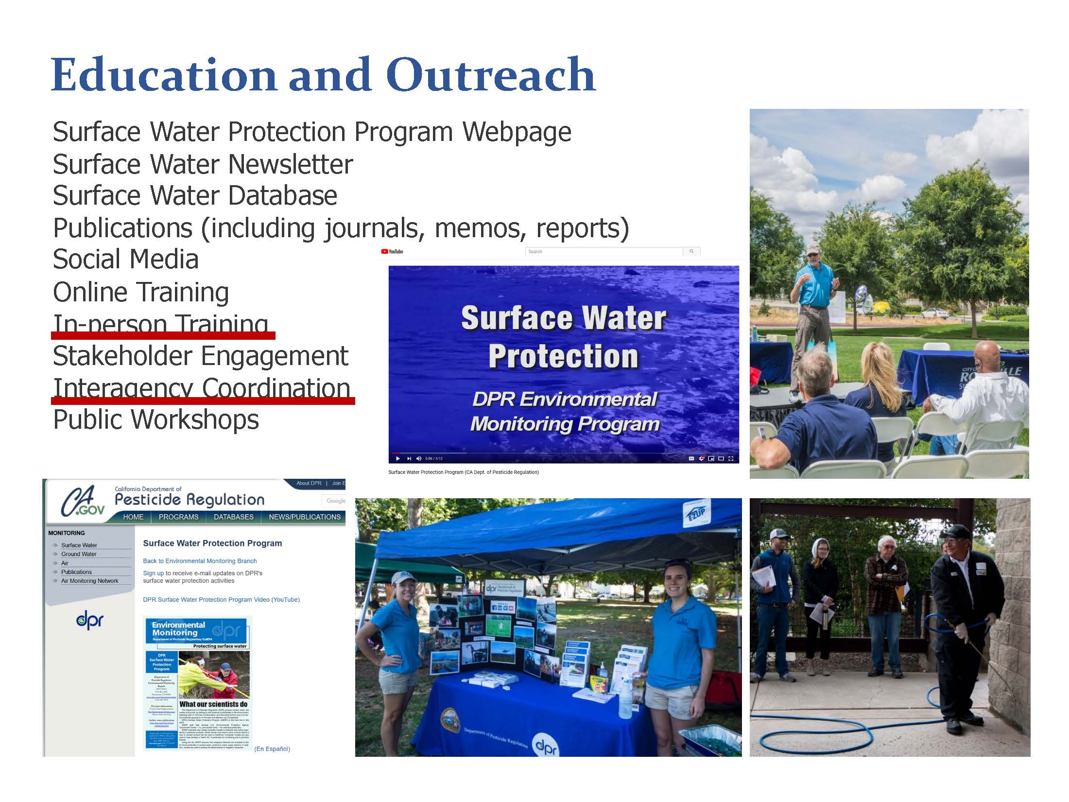 The Department of Pesticide Regulation conducts a number of education and outreach programs, including in-person training that focuses on pesticide application. They also coordinate with other agencies such as the state and regional water boards to ensure that the data that is collected as a part of permits is data that is useful to us and to also make sure that that data gets to them quickly.