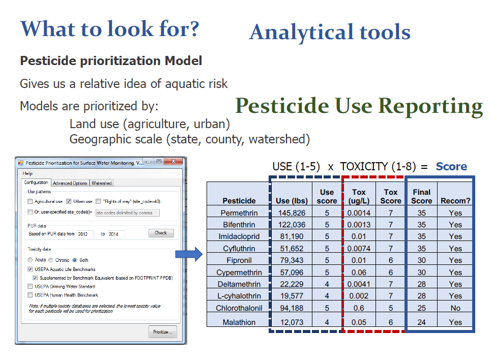 For monitoring, an analytical method needs to be in place in order to develop results. They use a modeling tools to look at the use of pesticides and their relative toxicity to determine what they should monitor for.