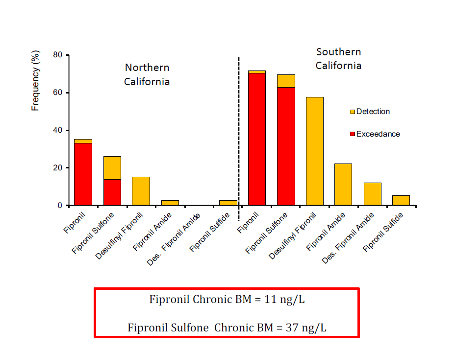 “The US EPA aquatic benchmark that we’ve used in this case is really low – 11 nanograms per liter, so essentially the take home message from this slide is that we’re seeing really high in both detection frequency and the exceedance of that benchmark of the parent as well as fipronil sulfone,” she said. “This sort of story is important and helps prioritize what we do when we move out of monitoring and into assessment and mitigation.”