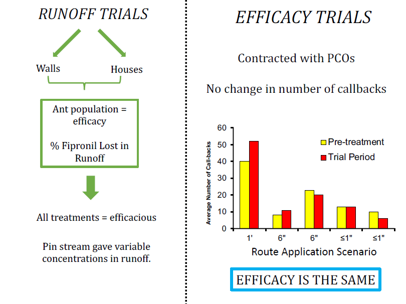 The Department could have gone straight to regulation; once a product is registered, it’s their responsibility to show that it is a specific threat. However, in this case, did some research, including runoff trials and efficacy trials. They tried a number of application scenarios and looked at the ant populations to determine if those applications were in fact efficacious. They also looked at the percent of fipronil that was coming off of those homes.