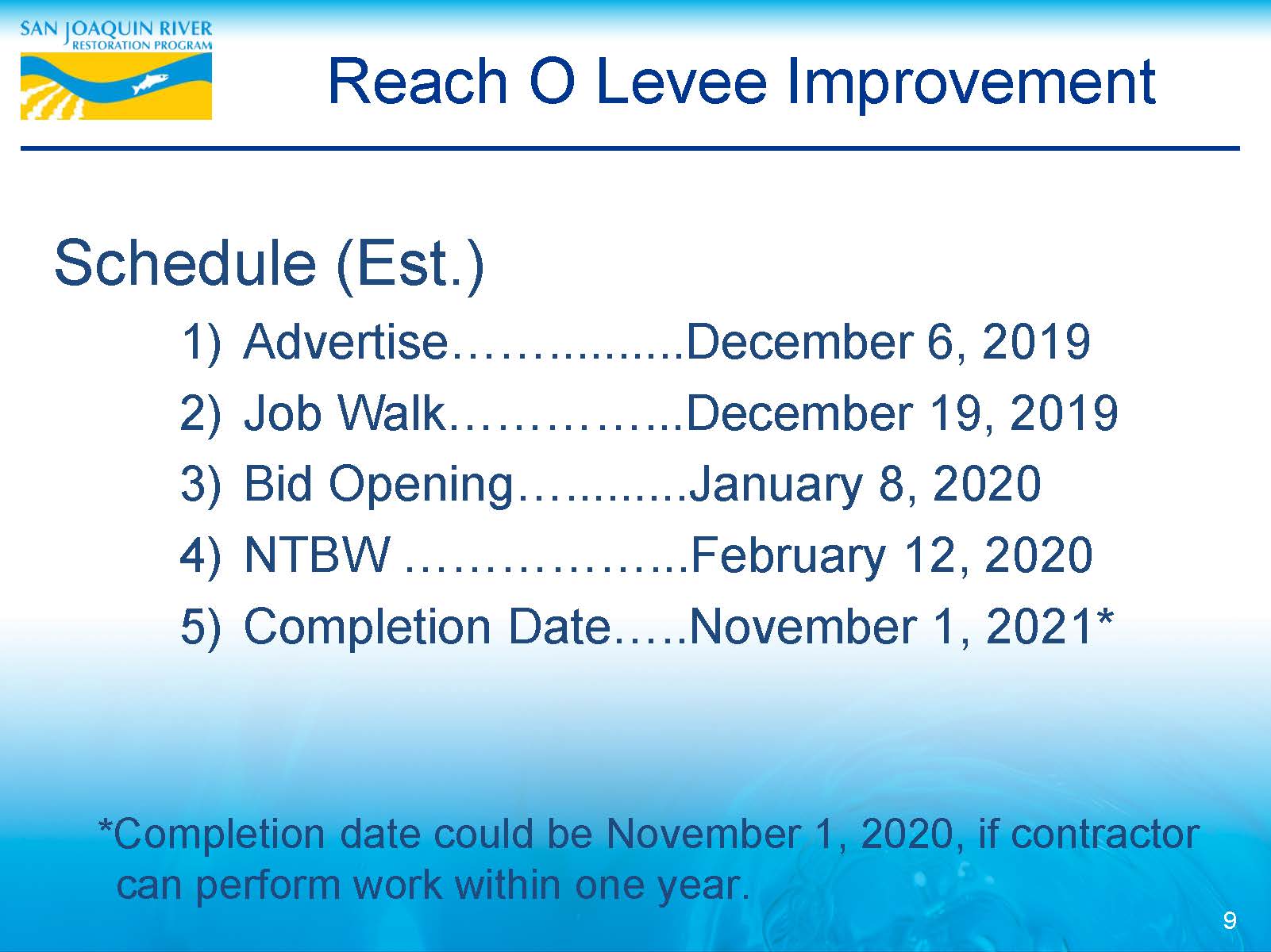 Levee improvements to the East Side Bypass: There is about a two mile stretch of the bypass levees that need to be improved to handle the flows up to 2500 cfs. They recently took potential contractors through the project and there was a lot of interest; they hope to have a contractor selected in February and be in construction late spring to early summer for this project.