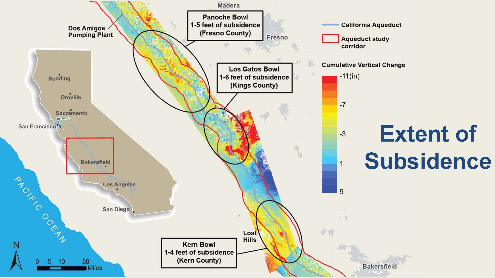 - The Panoche Bowl, which is approximately 47 miles of the Aqueduct from Pool 15 to Pool 18; this area has experienced maximum subsidence of approximately 5.5 feet since 1967.