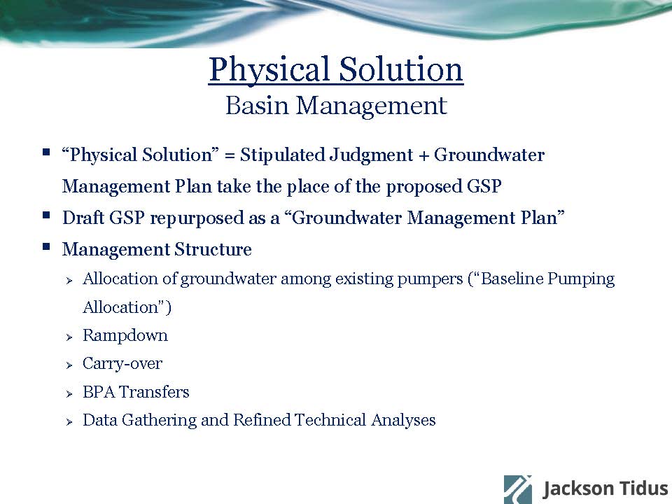 They negotiated the settlement by having teams of principals and attorneys for municipal users, agriculture, and recreation. It took half the year just to come up with a term sheet. They negotiated a settlement agreement and a stipulated judgment by the end of the year, and in an unusual move, both the settlement agreement and the proposed stipulated judgment was published for public comment. The physical solution is basically a stipulated judgment plus a groundwater management plan that takes the place of the GSP.