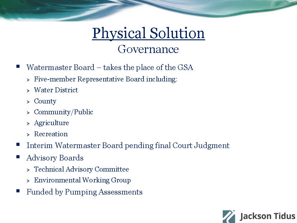 Also important is the governance structure. A 5-member watermaster board will take the place of the GSA that has representatives of the water district, the county, the public, agriculture and recreation, with each board member is appointed by those sectors. Pending entry of the judgment, there’s an interim watermaster board that’s subject to the settlement agreement.