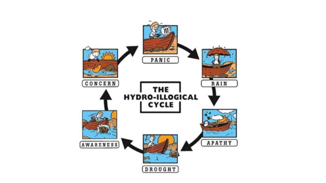 “There is another pattern in California, another place that is episodically struck by drought,” said Ms. Ely. “We call it the ‘hydro-illogical cycle’. During a drought, people become aware of their water use and step up to save water in big and small ways. Maybe we even pass legislation to keep everyone on the right track, but when rain comes, everyone is relieved and we return to our pre-drought routine.”