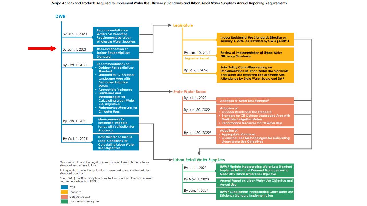 The arrow is pointing to one of the first upcoming deliverables. The 2018 conservation legislation directed the Department in coordination with the Board to study whether or not there is a standard for indoor water use that more appropriately reflects best practices. Ms. Ely said that the Department of Water Resources and the State Water Board are working together to try to understand indoor water use trends to consider whether the provisional standard is appropriate and to deliver a required report to the legislature by January 1, 2021.
