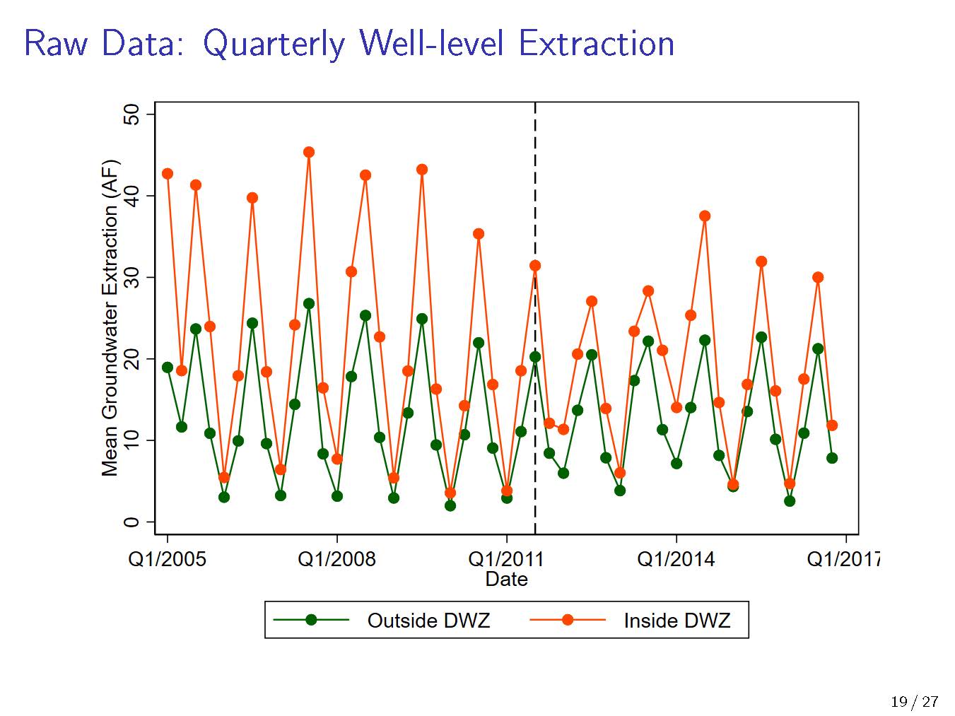 The slide at the lower left shows the raw quarterly groundwater extraction data from well level data; the dotted line notes the third quarter of 2011 which was when the price treatment began. Dr. Bruno noted that while you can’t tell a lot from the raw data, it does seem like something different is happening after the price change.