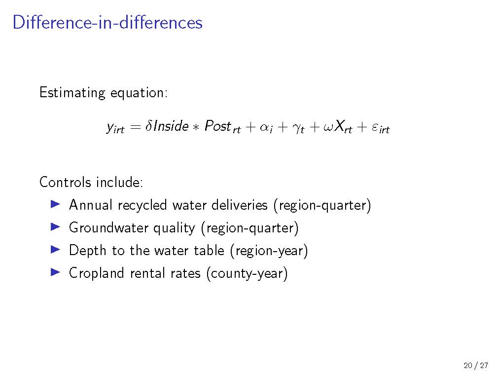 The study is doing a regression analysis for both water use and land use in three separate equations. The y variable on the left hand side in the equation on the upper right can be several different things, but in this case, it will be water use, irrigated usage, and total agricultural land. The parameter of interest is the Delta parameter which shows the differential effect of those inside the delivered water zone. Other parameters on the right control for parcel level fixed effects, aggregate time varying shocks which is anything that happens to everyone in the basin at any given point in time, and the control variables such as the recycled water deliveries, groundwater quality, depth to the water table, rental rates for the farmland, and things that could potentially change at the region level over time that might be correlated with treatment and are outcome variables and if excluded, could potentially bias their estimate of the treatment effect.