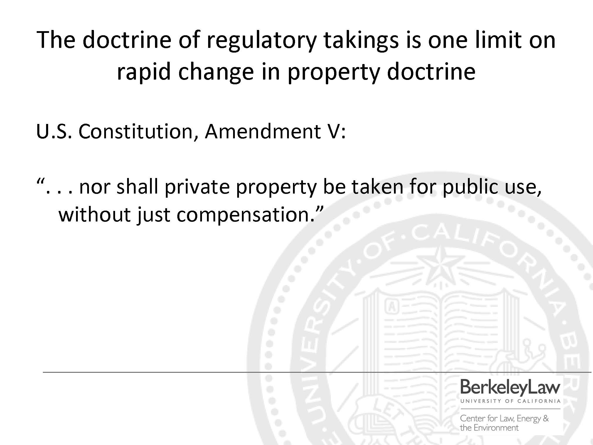 “None of those changes have been quick, they’ve all been the subject of controversy and conflict, and they’ve been limited to some extent by the doctrine of regulatory takings,” said Ms. Doremus. “The Fifth Amendment to the U.S. Constitution says ‘nor shall private property be taken for public use without just compensation.’ What that’s been taken to mean is that the government has to pay. If the government physically appropriates your property for something like a roadway or a reservoir, we often do that through eminent domain; in California, it’s called condemnation. But it’s also the case that the government has to pay if it changes the rules of property ownership too drastically or too quickly. If there is something you used to be able to do with your property, and either the courts or the legislature or regulatory agency tells you that you can’t do that anymore – if that goes too far, the government has to pay you for that under the regulatory takings doctrine.”
