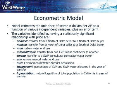 “The model has an R squared of .55 which indicates that the independent variables explain approximately 55% of dispersion in unit price for spot market transfers,” said Ms. Arnao. “All independent variables tested were statistically significant with a 99% confidence interval. The dependent variables is the natural log of the adjusted unit price of water in dollars per acre-foot.”