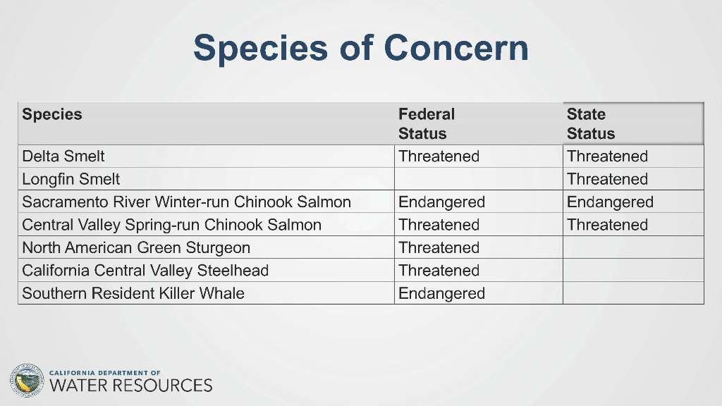 There were new biological opinions issued from the National Marine Fisheries Service and the US Fish and Wildlife Service in October of 2019 which direct the actions to be taken within the Delta to mitigate the operations of both the State Water Project and the Central Valley Project, a joint responsibility between the Department and the Bureau of Reclamation. Additionally, a new Incidental Take Permit from the California Department of Fish and Wildlife issued in March of 2020 directs the actions the Department must take to mitigate the effects of the State Water Project operations.