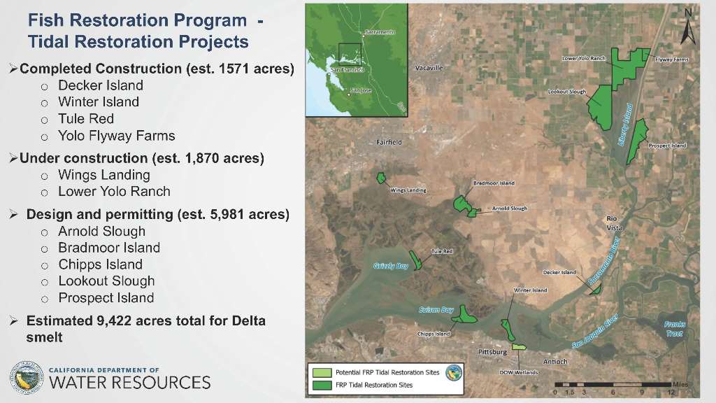 The areas shown in green are the tidal restoration projects. There are eleven projects in various stages of development that when completed, will restore over 9000 acres of tidal marsh habitat for Delta smelt.