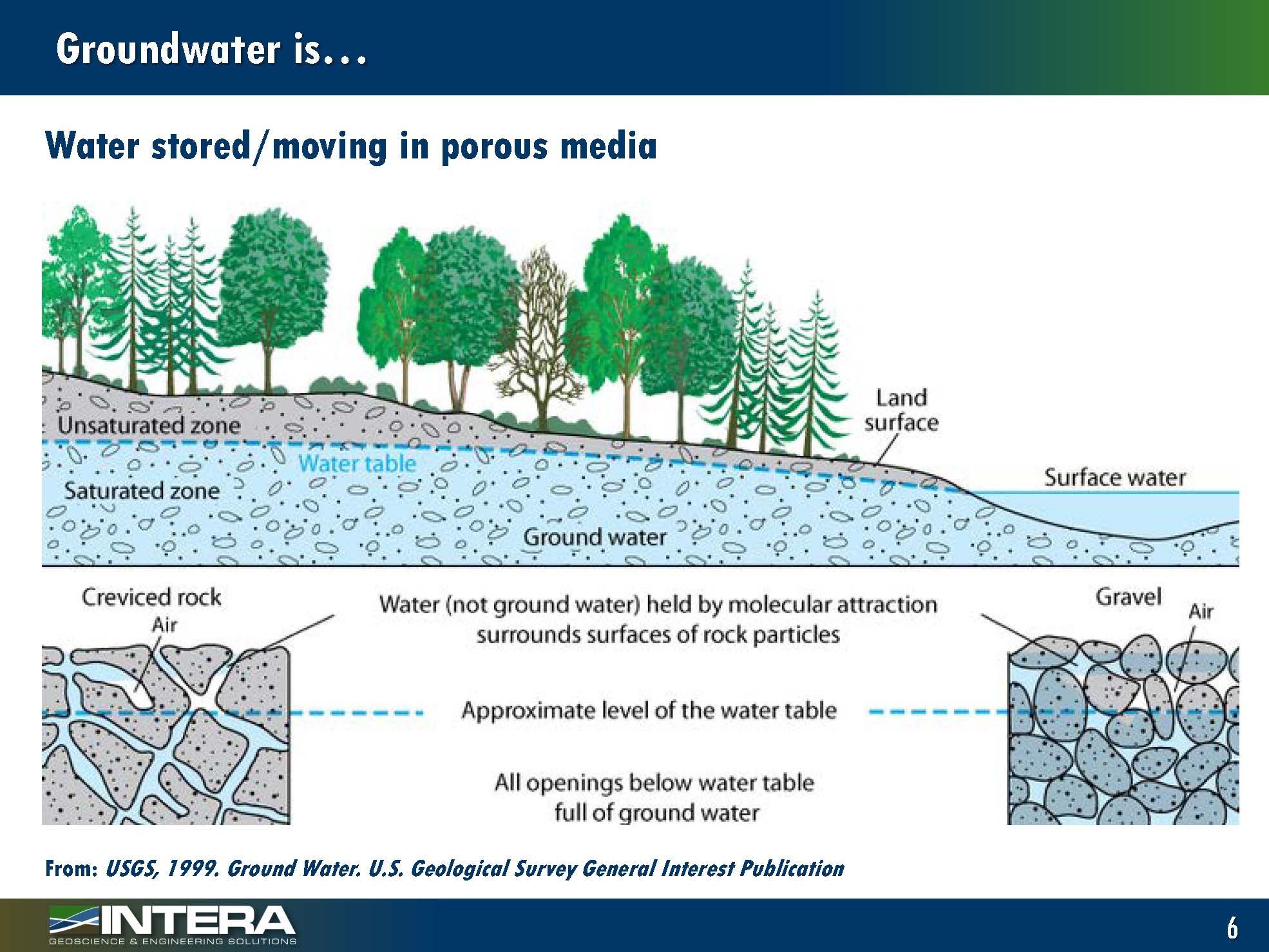 Groundwater is water stored or moving in porous media in the saturated part of the subsurface; water in the vadose zone (or unsaturated zone) is technically not groundwater; it’s held by capillarity and follows similar physical laws.
