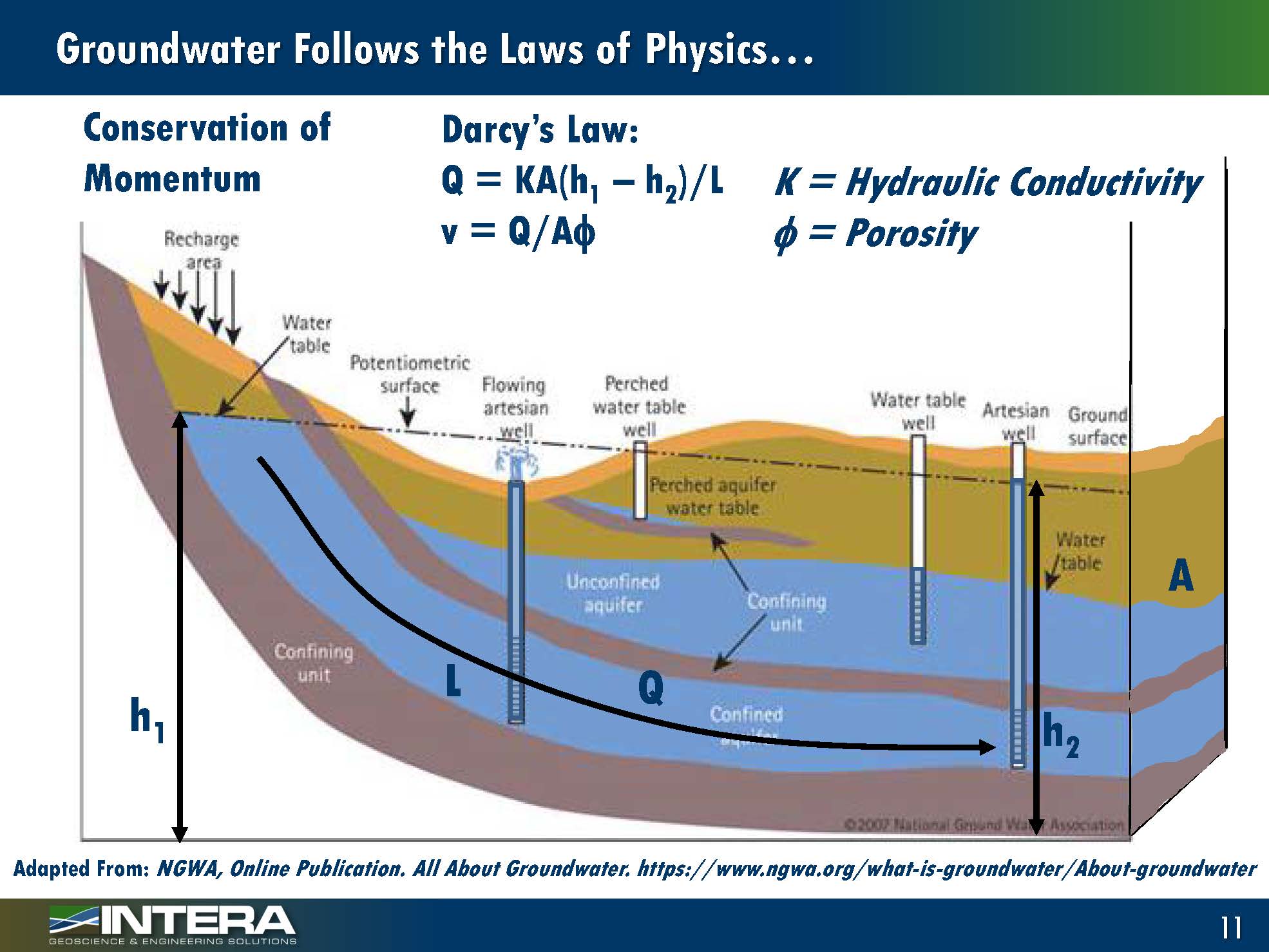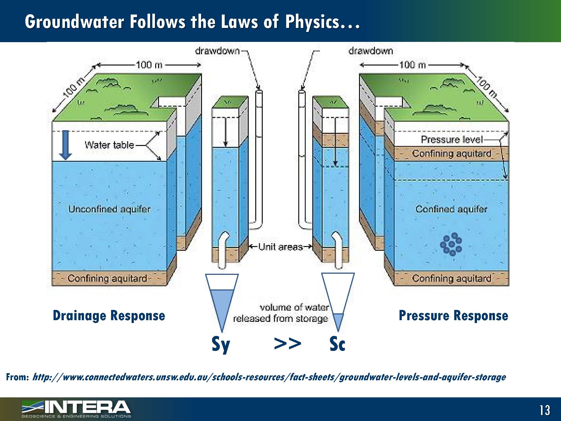 Groundwater follows the laws of physics, and over the last hundred years or so, a lot of understanding has been developed on what laws of physics groundwater follow. Some of the fundamental laws are conservation of mass and volume, where inflows minus outflows change storage and conservation of momentum (or Darcy’s Law). If groundwater is at different elevations, the flow through that system depends on the head gradient as well as the hydraulic connectivity. The groundwater velocity through the aquifer depends on the flow as well as the porosity.