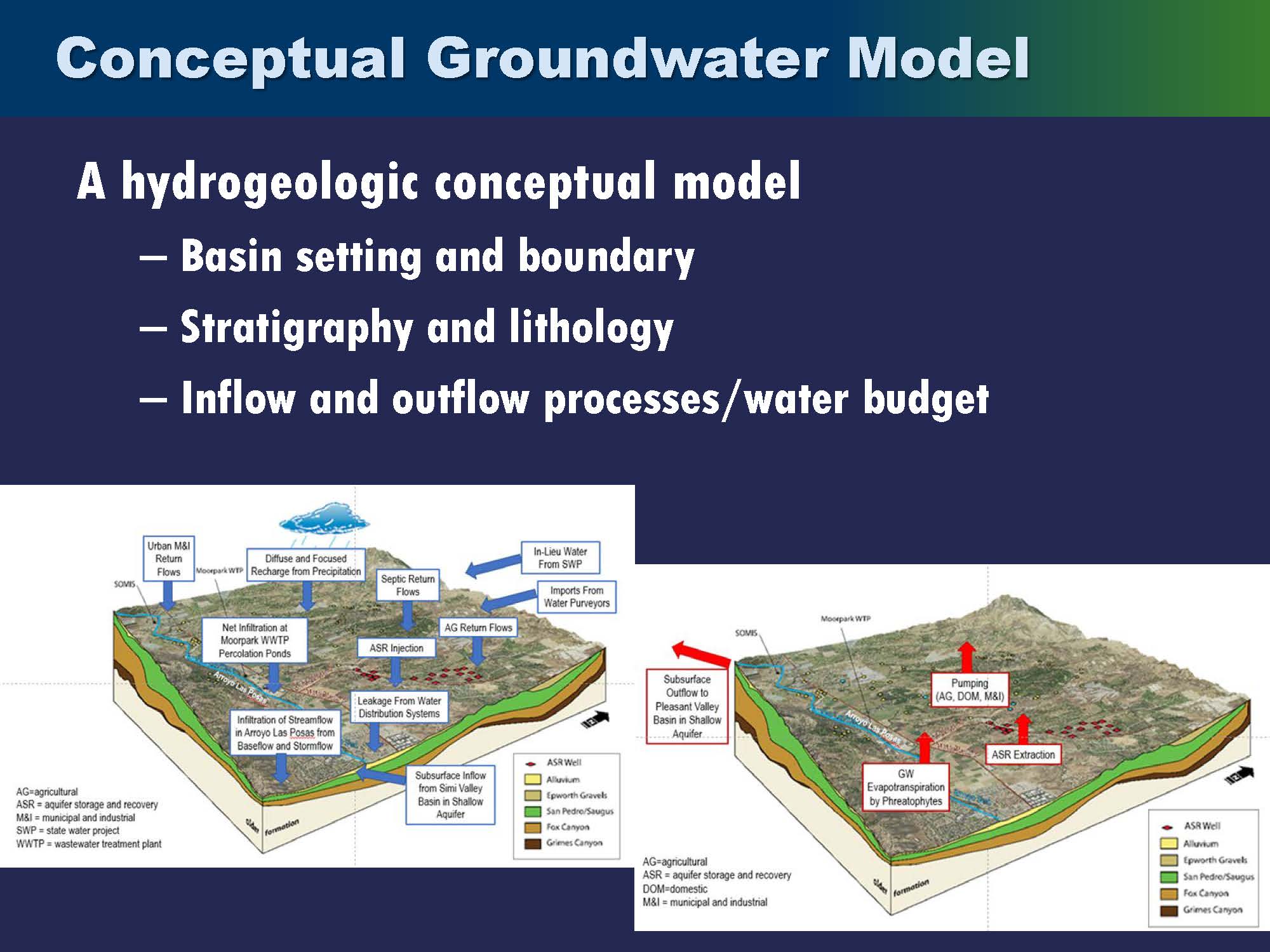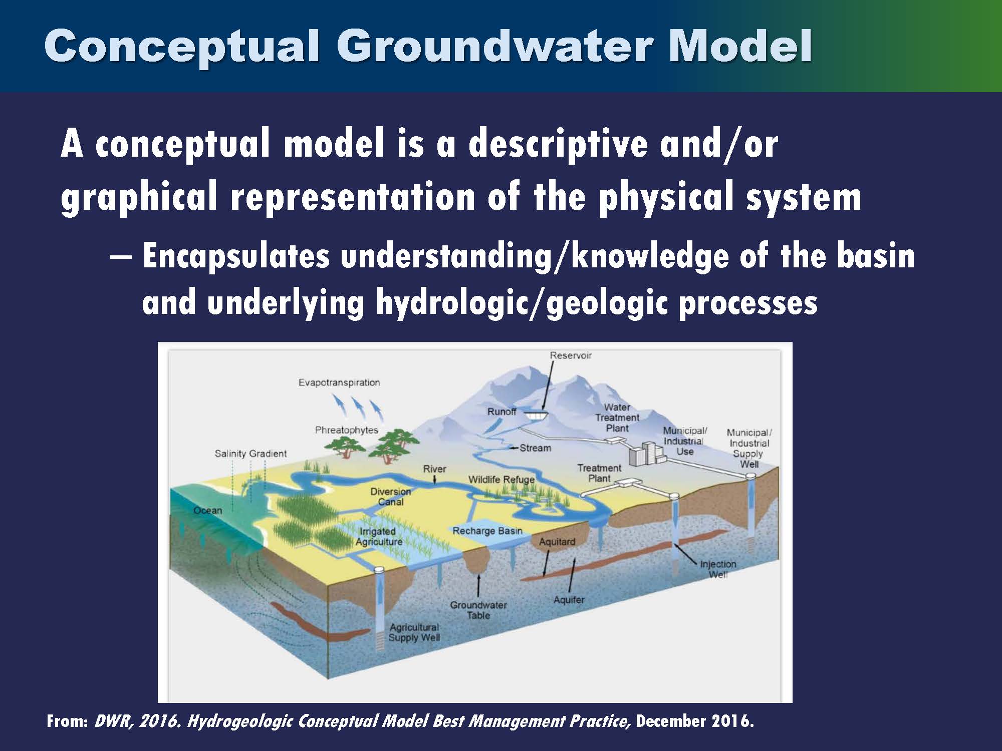 A conceptual model can be a descriptive or a graphical representation of the physical system. Its purpose is to encapsulate the understanding or knowledge of the basin and the underlying hydrologic or geologic processes. Developing the conceptual model can sometimes be very complex, and oftentimes it’s where the most time is spent because you’re dealing with the lack of understanding and developing an understanding from data.
