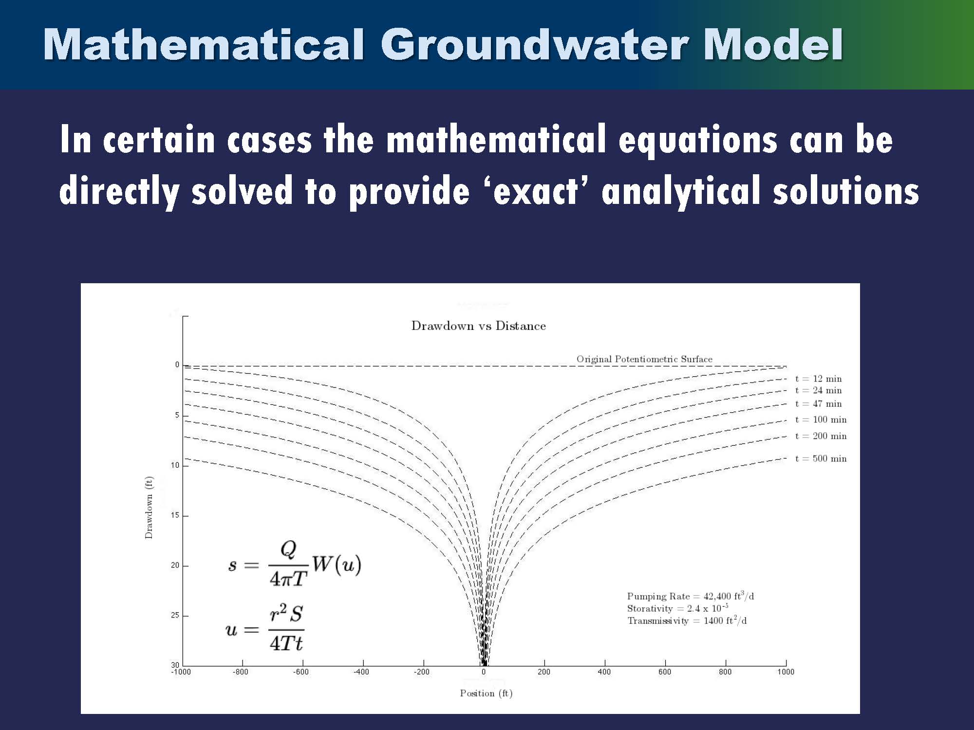 In certain cases, the mathematical equation can be directly solved. “For example, this is your classic Theis equation where we know the transient drawdown response to pumping at a location,” Dr. Singh said. “There are several analytical solutions for different boundary conditions and different assumptions for the processes underlying the groundwater aquifer, and so these analytical solutions are exact in that they don’t rely on numerical discretization; you just solve the mathematical equation, and you have an exact answer at any given point in space or time.”
