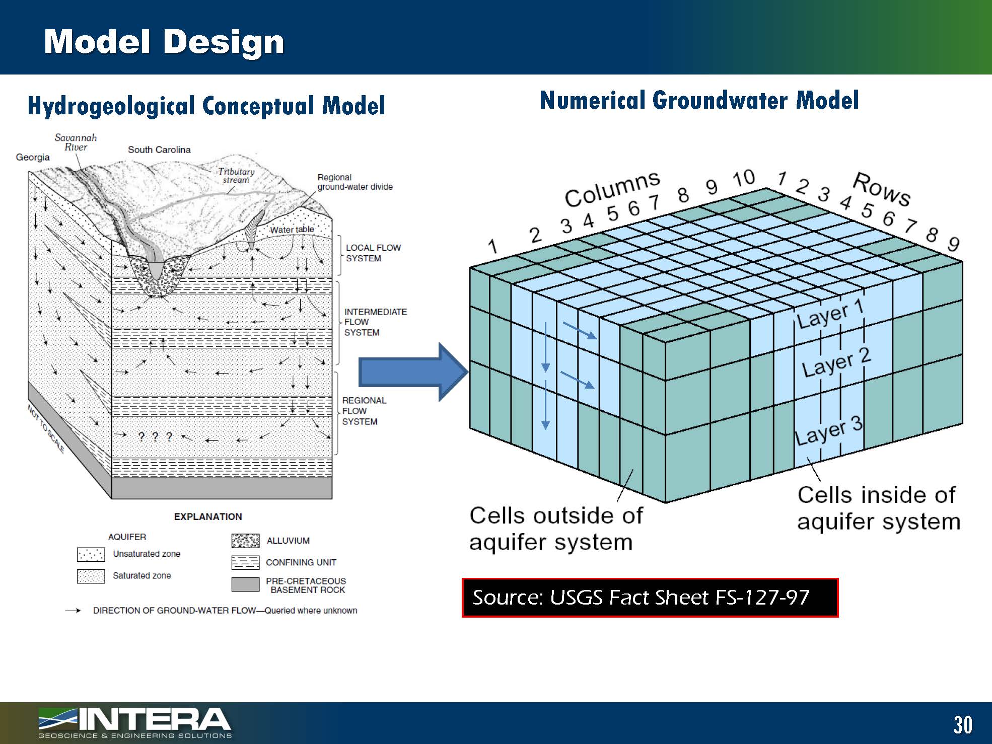 The model design phase itself starts with the conceptual model. Everything has to be linked to the conceptual model, Dr. Singh said. So the conceptual model is broken down into smaller and smaller pieces to represent the aquifer as a series of grids and layers with some of these layers representing boundaries and some of these cells represent the actual aquifer system.
