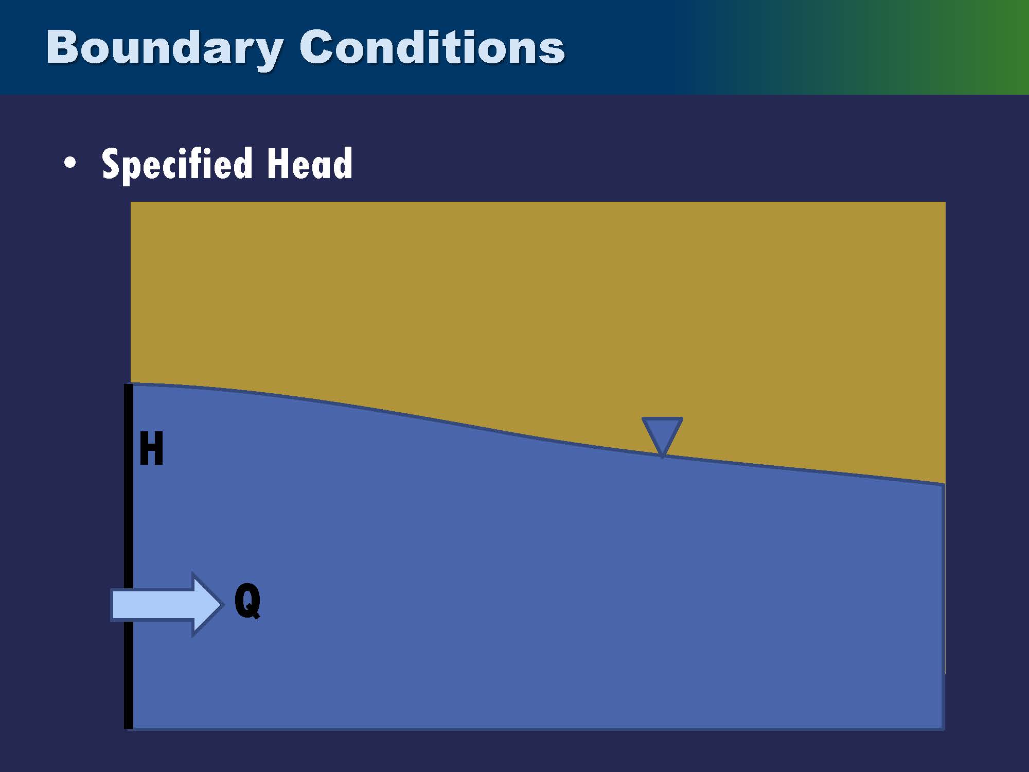 In specified head boundaries, the head remains constant. Water is simulated as moving in or out of the groundwater at a rate sufficient to maintain the specified head. Specified head boundaries typically represent a boundary of the body of water of where there is a known fixed elevation.