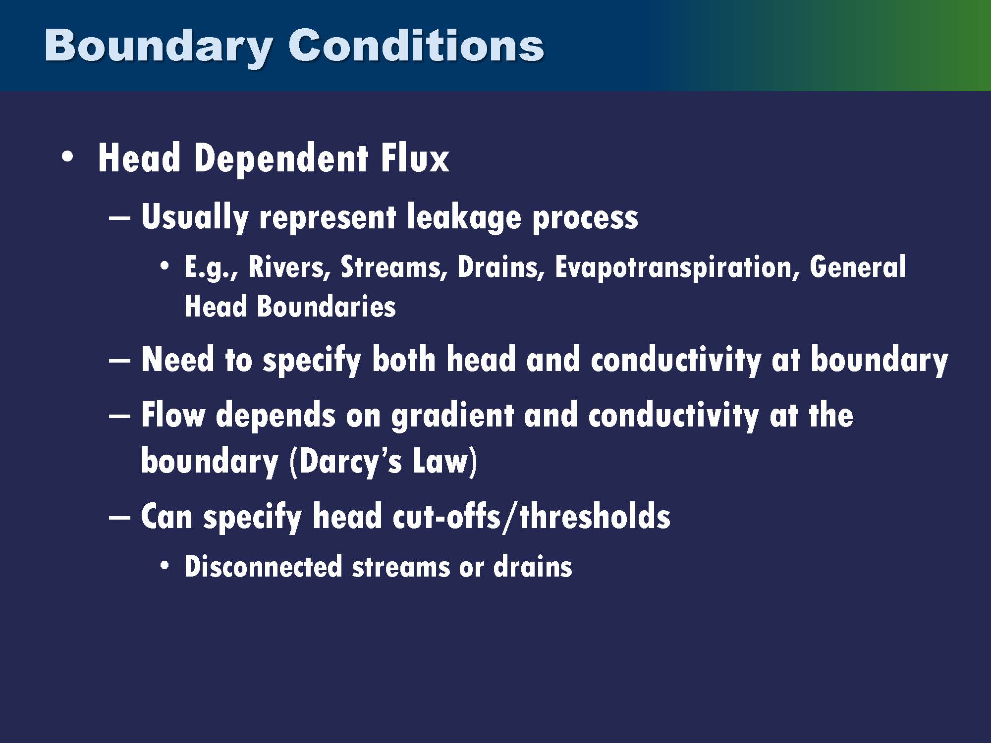 In head-dependent flux boundaries, the rate of flow from the boundary into or out of the groundwater varies in response to changes in the head in the boundary cell. They usually represent leakage processes. These are the boundary conditions that are the most flexible, so they are used for rivers, streams, drains, evapotranspiration, and general head boundaries.