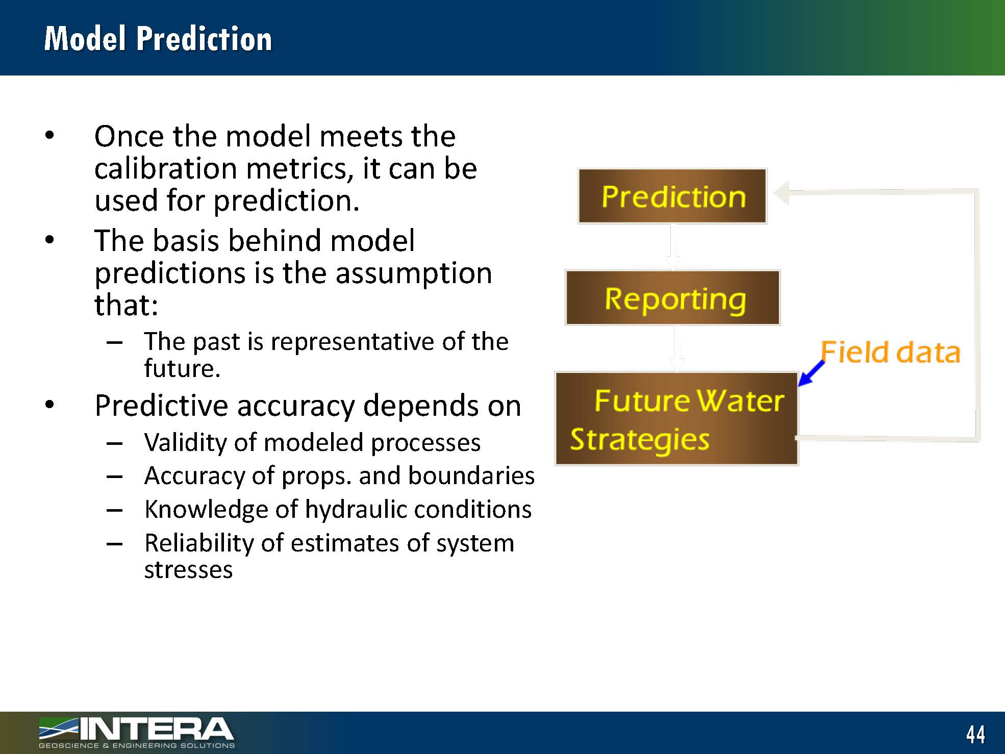 Once the model is calibrated, the model is verified by running it through a period of record that was not used for calibration purposes. Once the model has been calibrated and verified, you get into the prediction mode. Now you start running your model with changes to boundary conditions or stresses in the future to assess how the basin will respond to those changes. There is also reporting and integration into the overall water management strategies.