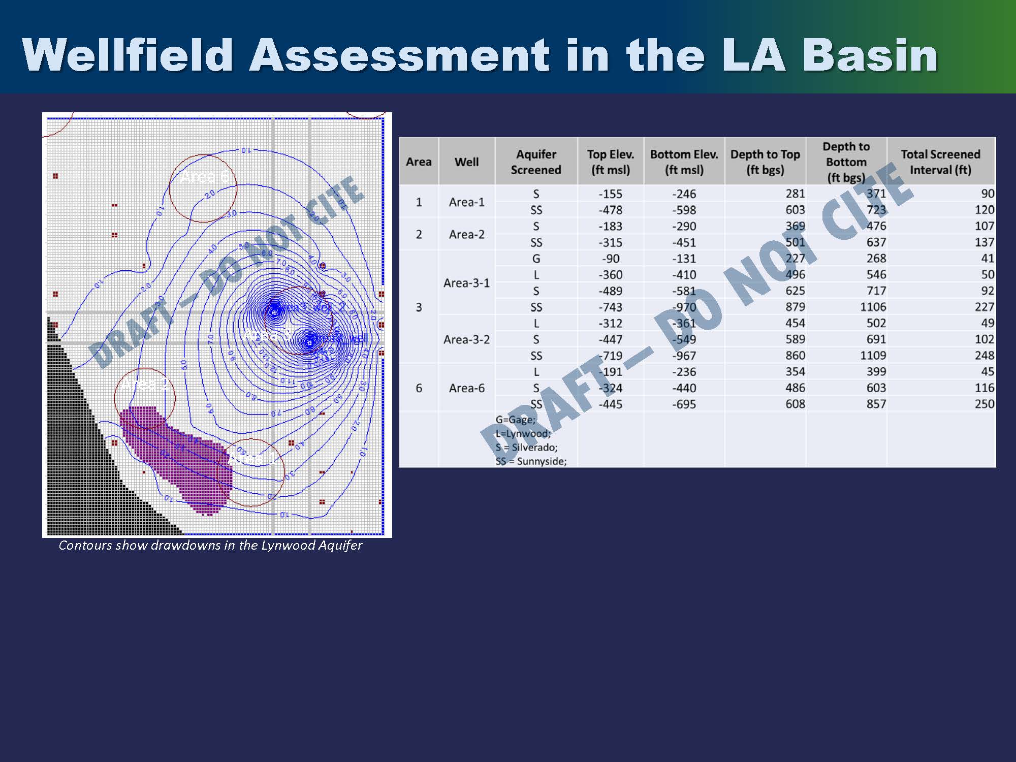 The LA DWP was interested in siting, feasibility, and preliminary designs for wellfields; there were six locations under consideration. The region model was a four-layer model that they broke up into thirteen layers to correspond with the aquifers and aquitards in the basin.