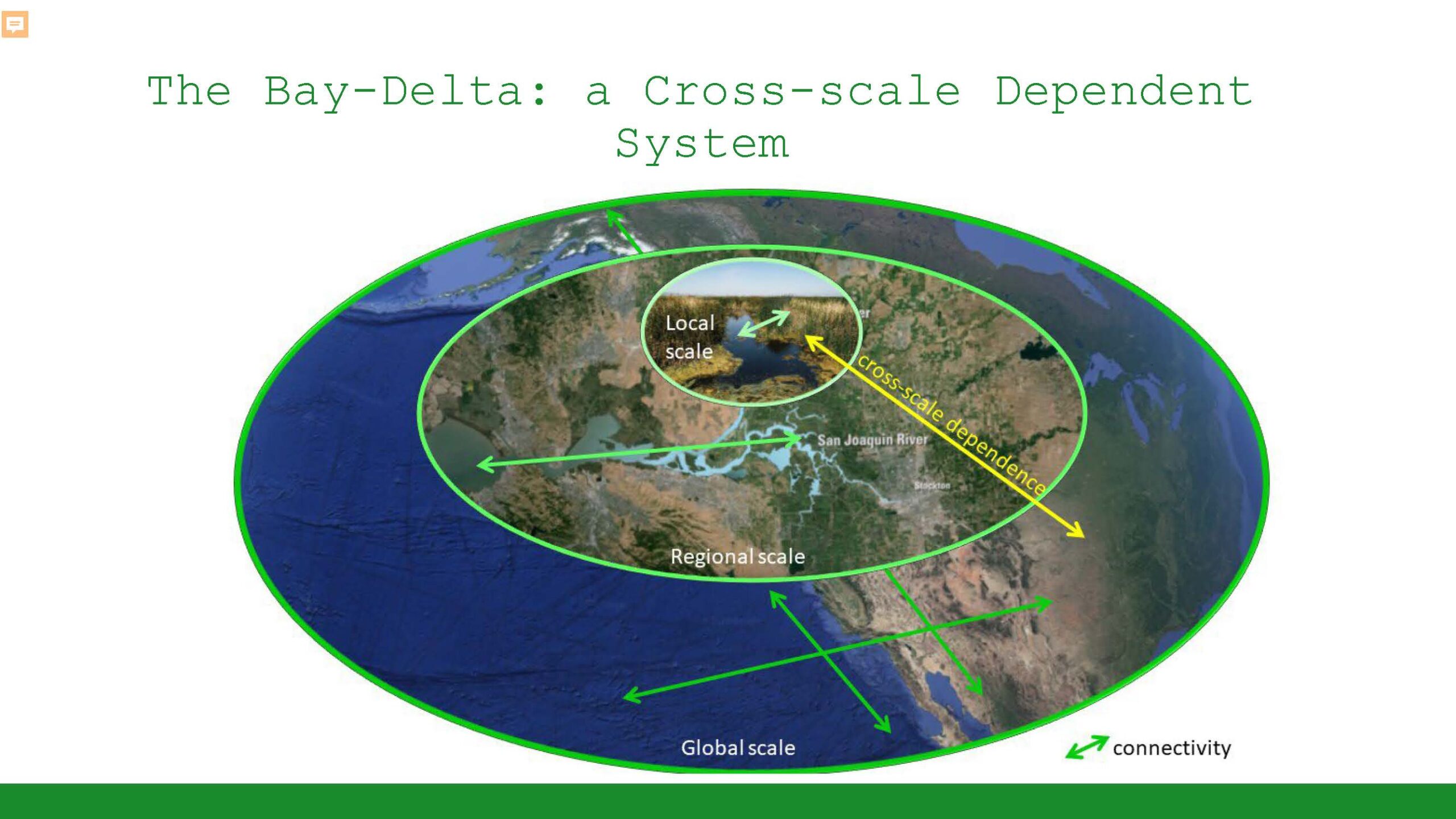 “One important thing that we realized is that the Delta is a fine example of a cross-scale dependent system – a big word, but this figure illustrates nicely what that means,” said Dr. Keeley. “It means that ecological processes at one scale depend on ecological processes occurring at the different scales. So connectivity at the local scale, the small oval, depends on connectivity at the regional scale, the medium oval, which depends on connectivity at the global scale, and vice versa.”