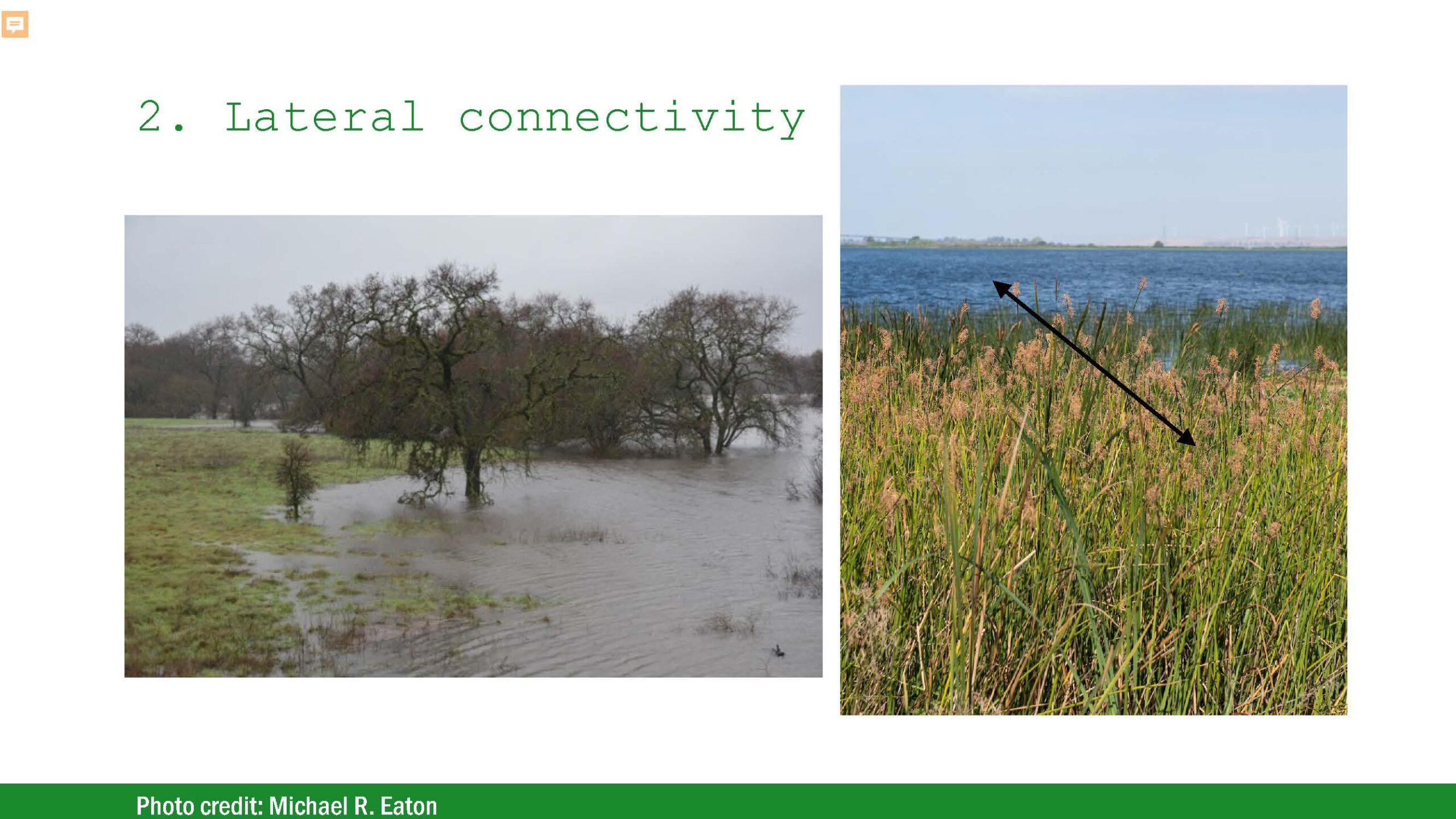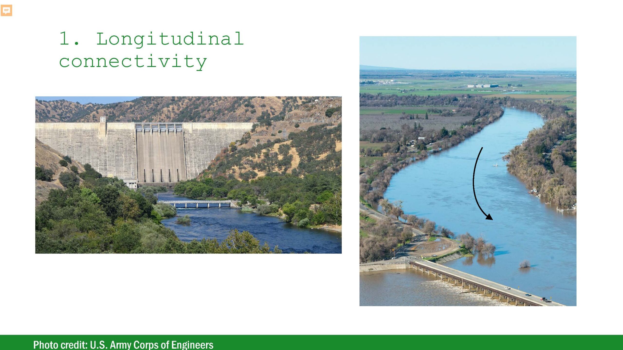 She also noted that the loss of food and low-velocity resting and hiding spots caused by levees is an effect of the lack of lateral and vertical connectivity. Also, the increased predation rates caused by non-native species is an effect of connectivity to adjacent and distant ecoscapes.