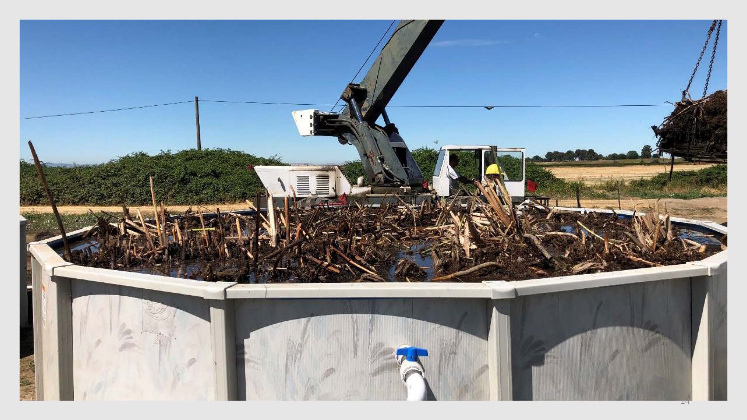 Eight Doughboy pools were built adjacent to the Mokelumne River on Bouldin Island. Blocks of peat were excavated from Twitchell Island, moved over to Bouldin Island, and placed in the pools. The blocks were about two feet wide, four feet long, and one foot thick. They measured the weight of the blocks and estimated their volume. The blocks were less dense then the water, so everything floated, without any vegetation, and without really much roots extending from the blocks.
