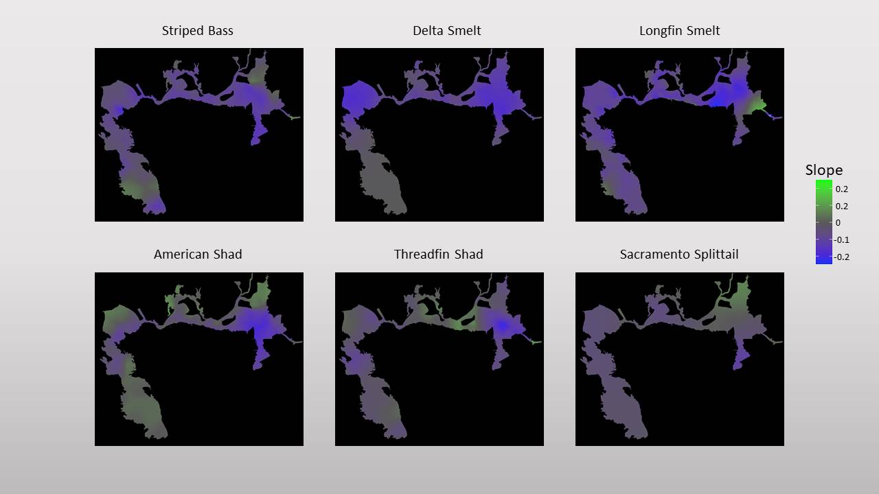 “Looking across all these different plots that in general, there’s more blue than green with a couple of notable exceptions,” said Mr. Stompe. “American shad appear to be increasing in density in Suisun Marsh and the north Delta; threadfin shad in upper Suisun and Decker Island- Lower Sacramento River Corridor, and Sacramento splittail in the northern portions of the Delta. We saw some of this with threadfin shad really constraining their population as they experienced declines in the central and southern Delta.”