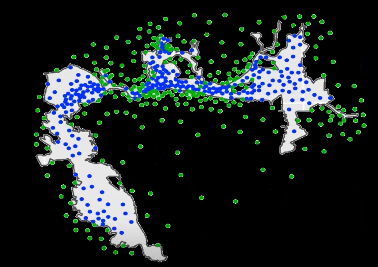 The data set was then used in a generalized linear mixed model with spatial and spatiotemporal autocorrelation fit to the spatial mesh; they then applied a spatial barrier, so the information sharing between the regions and that spatial mesh is constrained to only the wetted area, which gives a more accurate representation of regional trends and fish distribution within the estuary, as shown on the upper right.