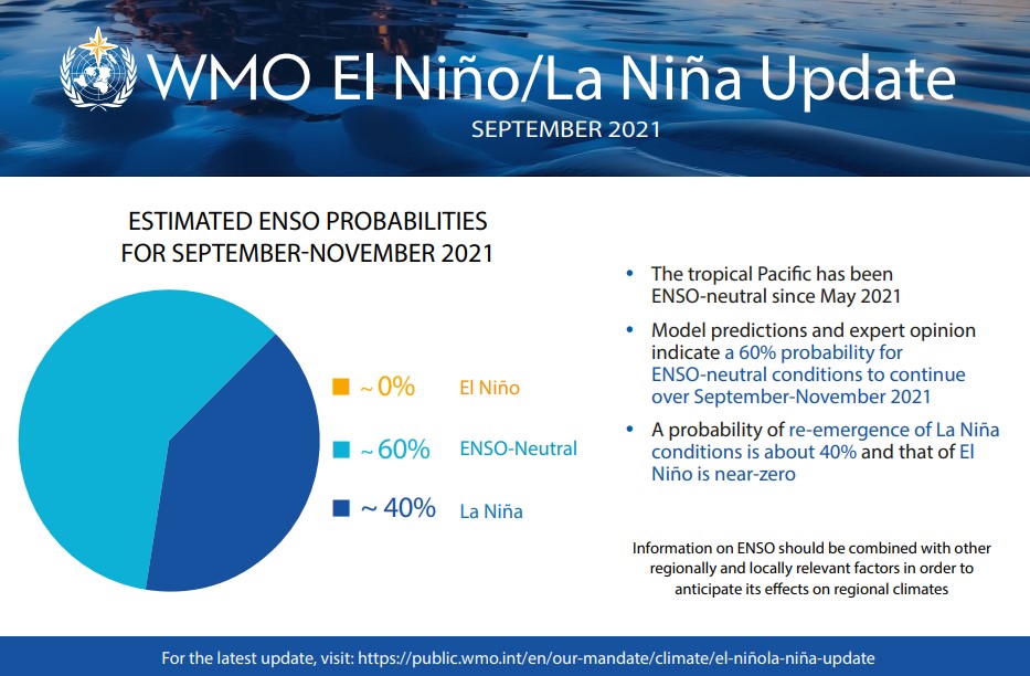 “A weak La Niña event may re-emerge later in 2021 for the second consecutive year, with the risk that forecast precipitation patterns may exacerbate existing drought in some parts of the world and increase the risk of heavy rainfall and flooding in others. But despite La Niña’s cooling influence, temperatures over land areas are expected to be above average between September and November, especially in the northern hemisphere, according to the World Meteorological Organization. … ” Read more from the World Meteorological Organization here: World Meteorological Organization: Weak La Niña may re-emerge