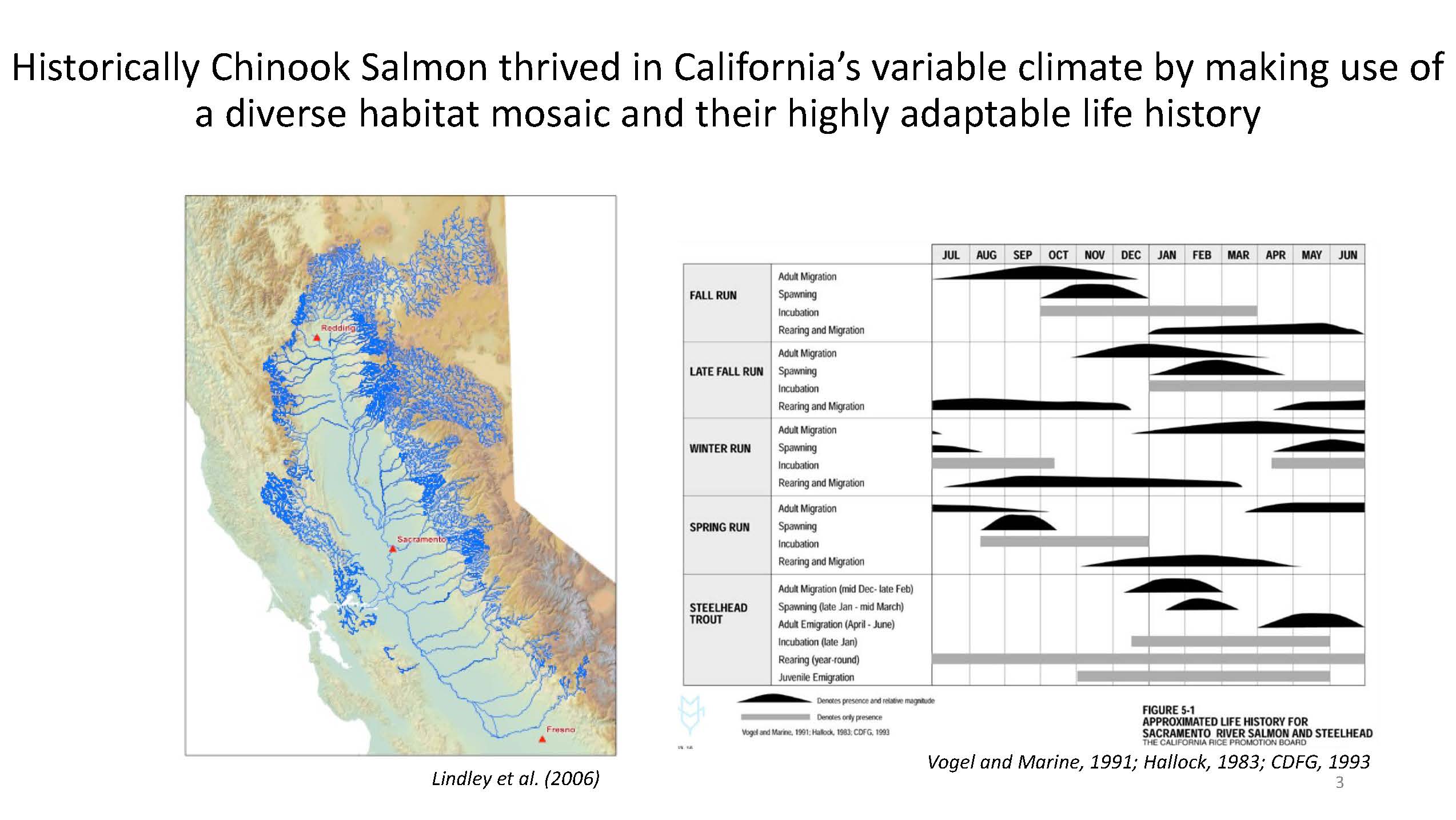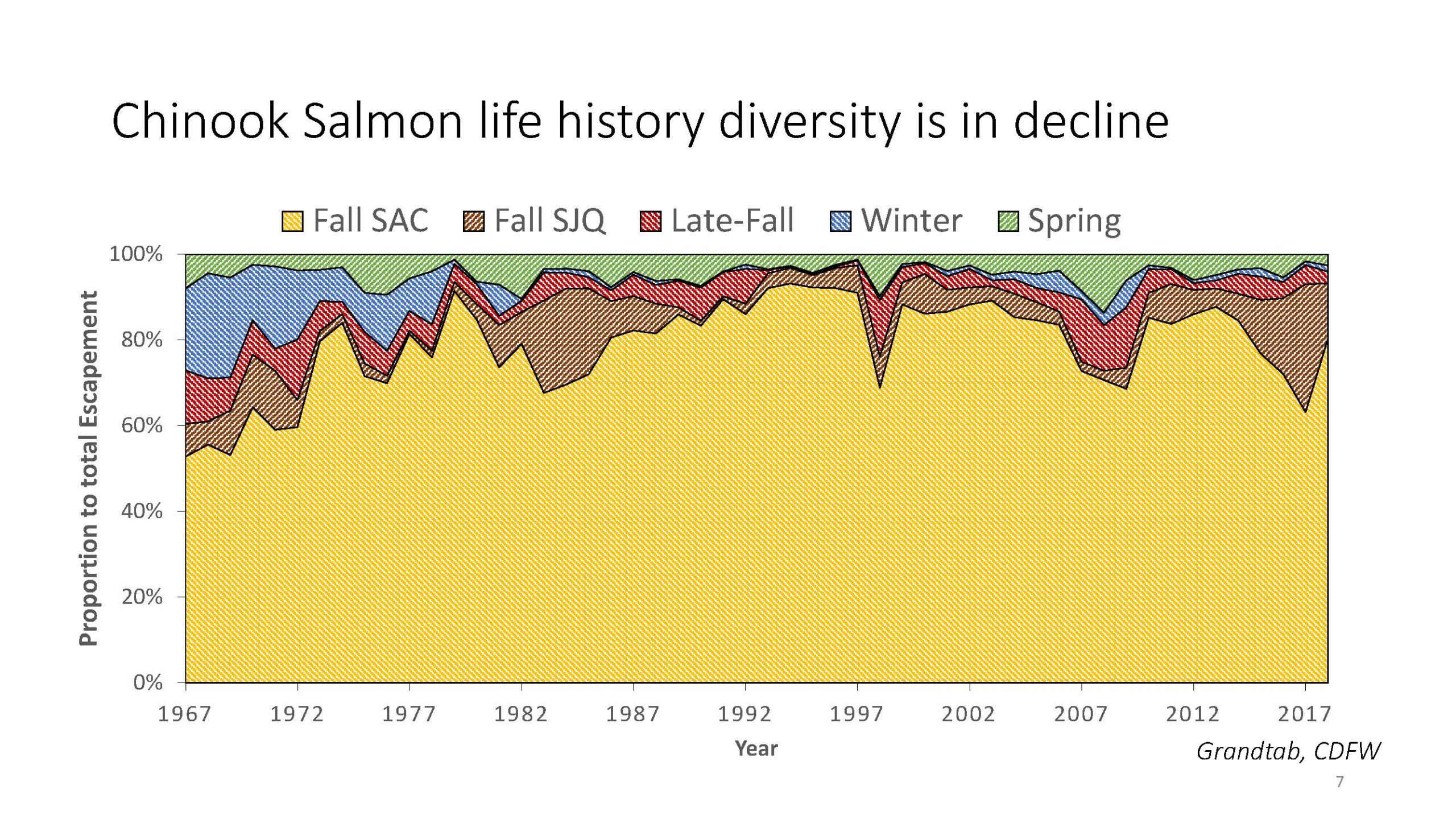 Chinook salmon have long thrived in California’s variable climate, including prolonged drought periods, by utilizing the historical Delta’s vast habitat mosaic and their adaptable life history. However, changes to the estuary from reclamation and development as well as climate change threaten the long-term survival of Central Valley chinook salmon.