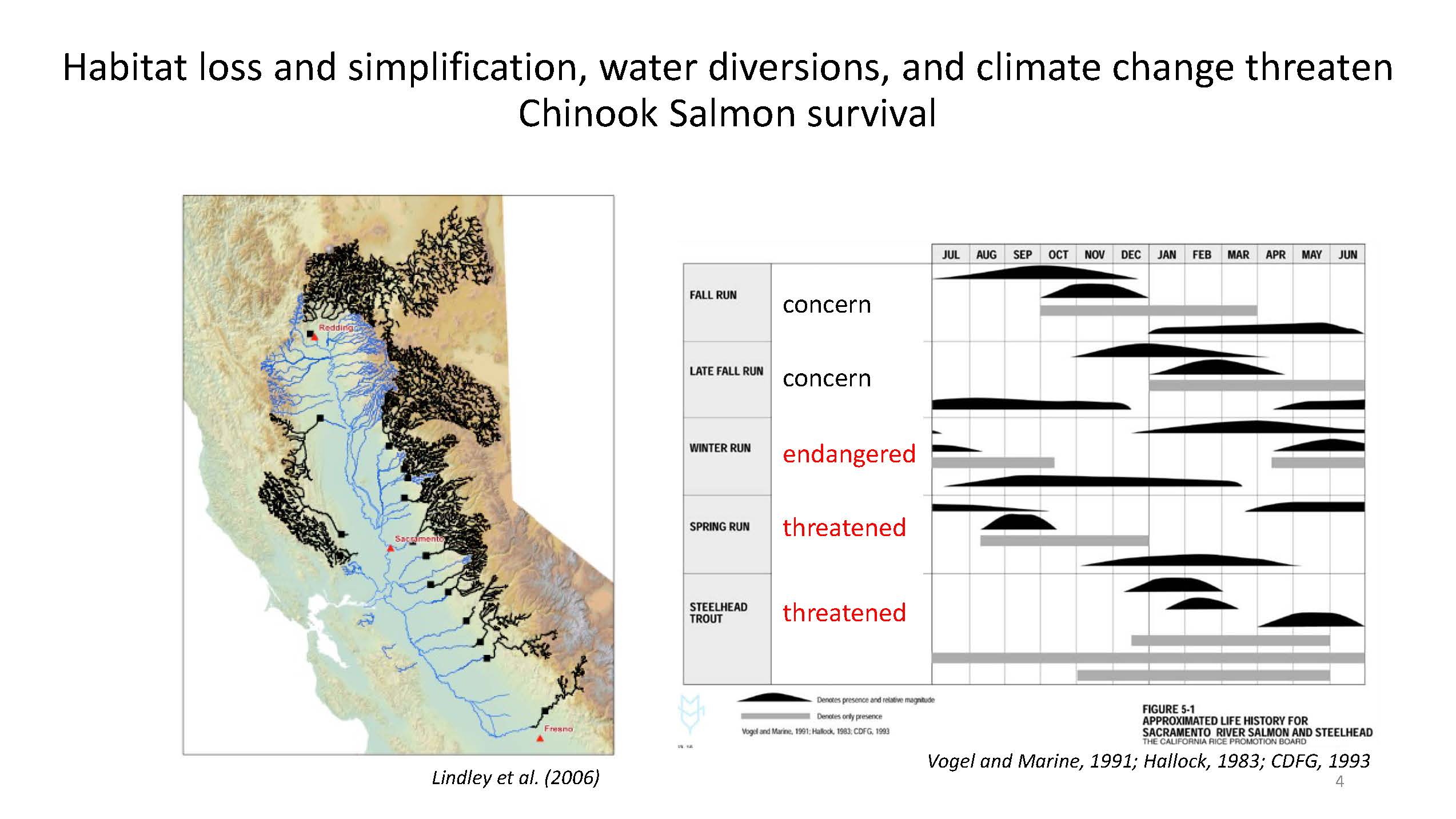 Despite the state’s conservation and management efforts, many salmonids in California are struggling and are facing an uncertain future. Historically, Central Valley chinook thrived in the variable climate using a diverse habitat mosaic and a highly adaptable life history. However, habitat loss and simplification, water diversions, and climate change threaten their long-term survival.